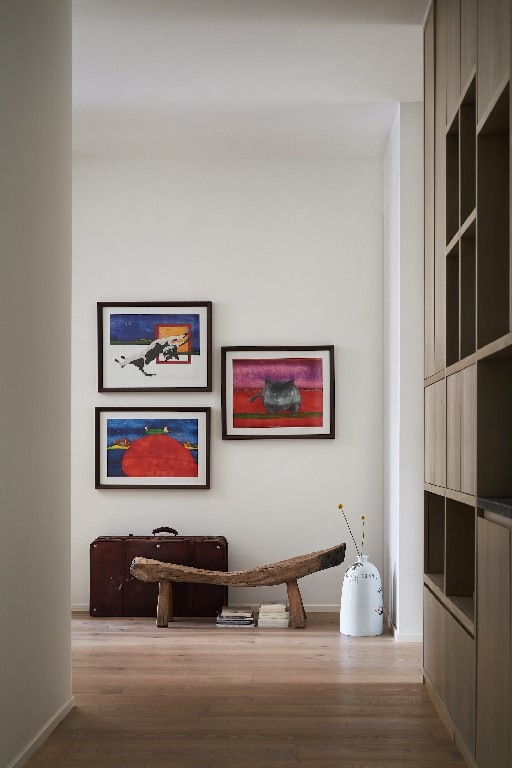 从中穿过,凝神而望,通道尽头的画是我朋友送我的,收藏有十余年之久,我一直以为这样画风的挂画会挂在儿童空间里,没想到挂在通道的尽头也意外地合适。地上的箱子是我妈妈给我的老物件,当时我很困惑不知道要把这个箱子放在哪里,谢辉说可以放在空间里,再加上旅行时买的板凳,这些老物件的组合自成一景,令这个房子散发着属于我个人的独特气息。