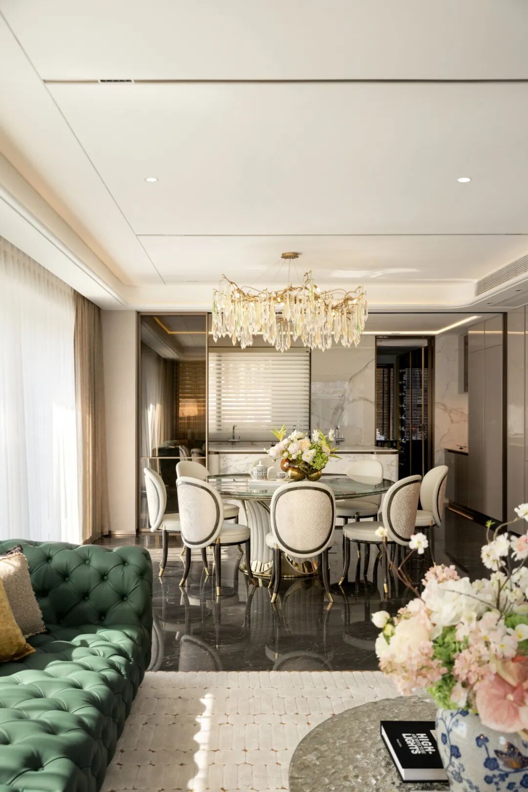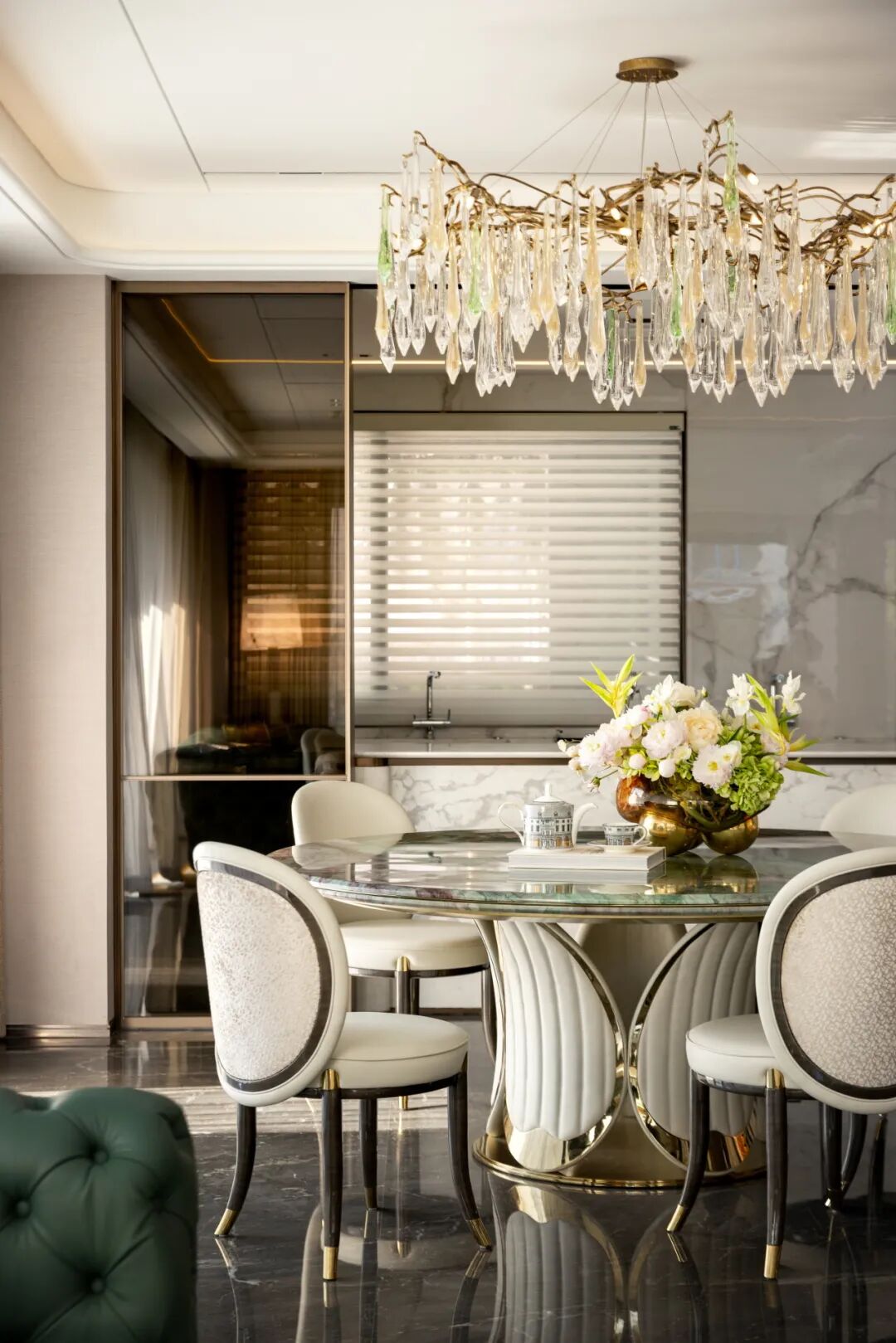 云白天穹之下,一袭水晶吊灯倾泻星子碎光,将优雅氛围轻柔晕染。餐厅区,澄澈如水的百达翡翠圆桌,环抱云絮般软包餐椅,一隅疏影横斜的花艺,悄然唤醒空间生机。客厅与餐厨无界相融,视线与气息自在流转。冷冽华美的大理石岛台、线条利落的橱柜,于简约中淬炼精致本真。