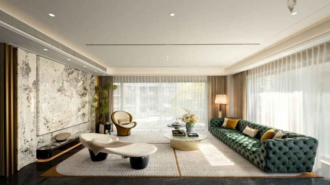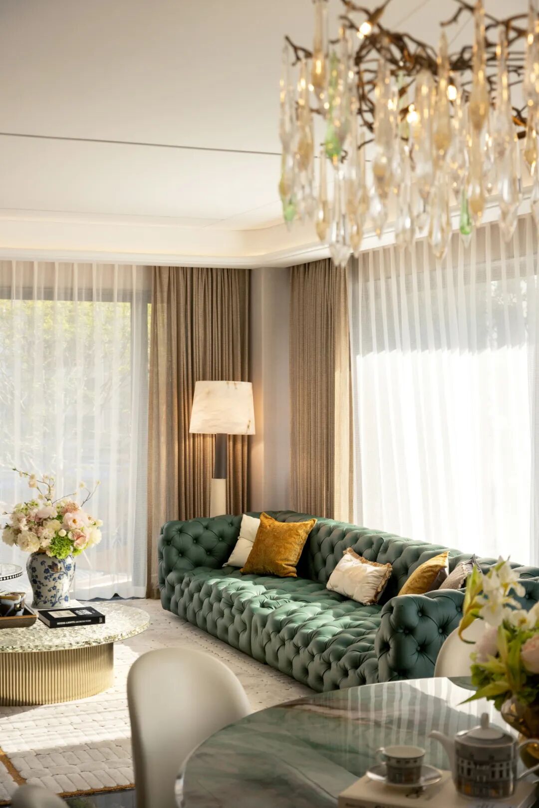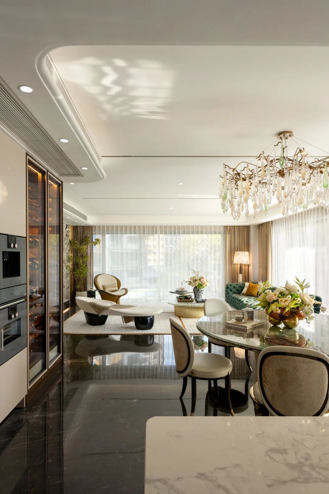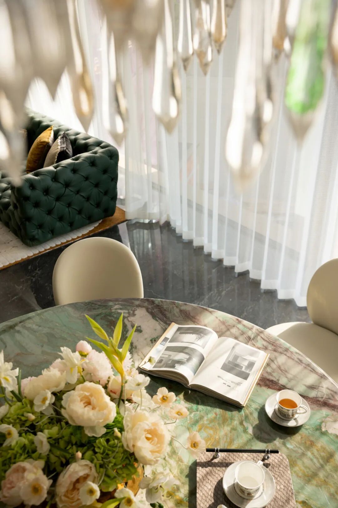 空间如一幅流动的现代诗卷,以开放式格局挥洒出无界的通透。视线无碍穿行,空气自在流转。一幅浑然天成的大理石背景墙,抽象泼墨式图案宛若凝固的山河,成为空间磅礴的视觉诗眼。墨绿丝绒沙发如天鹅绒包裹的绿洲,释放着舒适与尊贵的双重引力;BEBA扶手椅,雕塑般的造型和对细节的考究像盛开的花朵,邀请我们享受轻松且美丽的时刻。