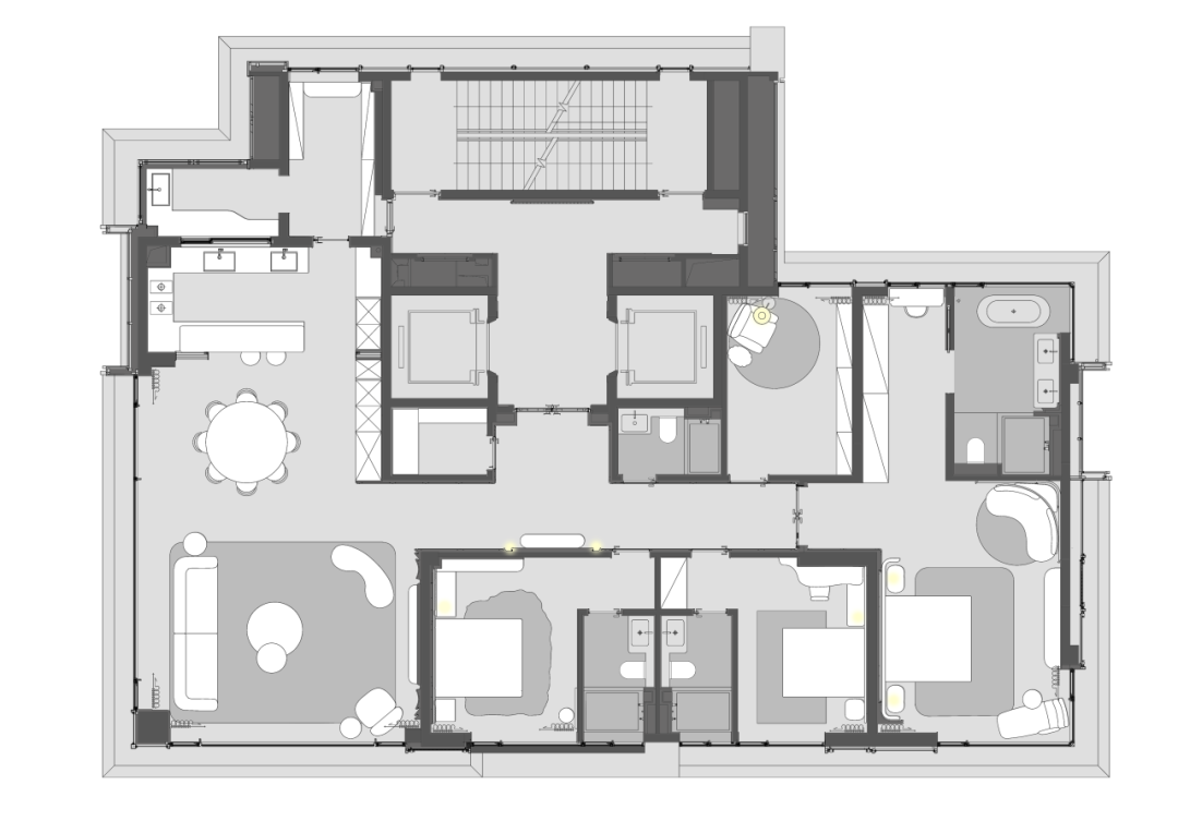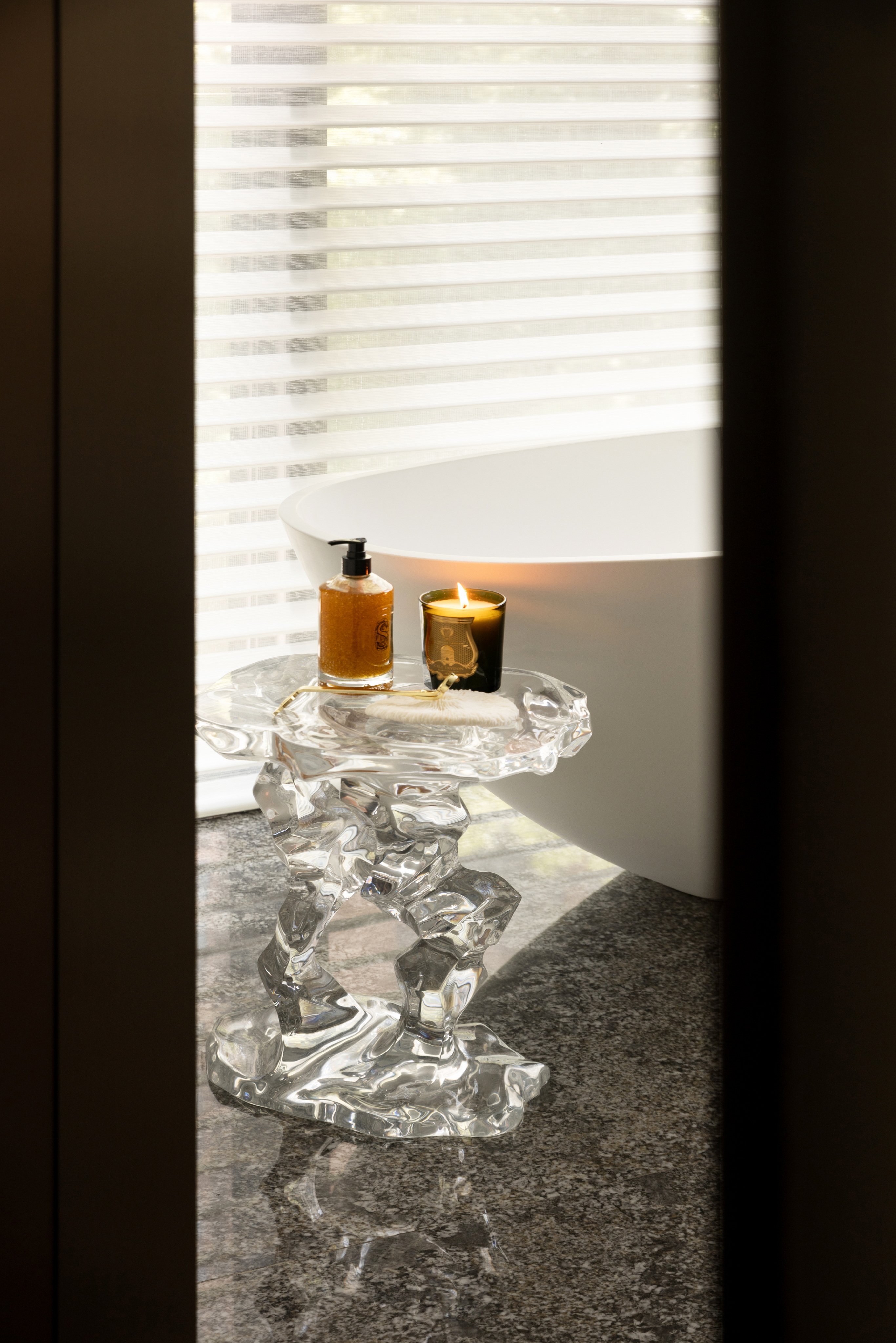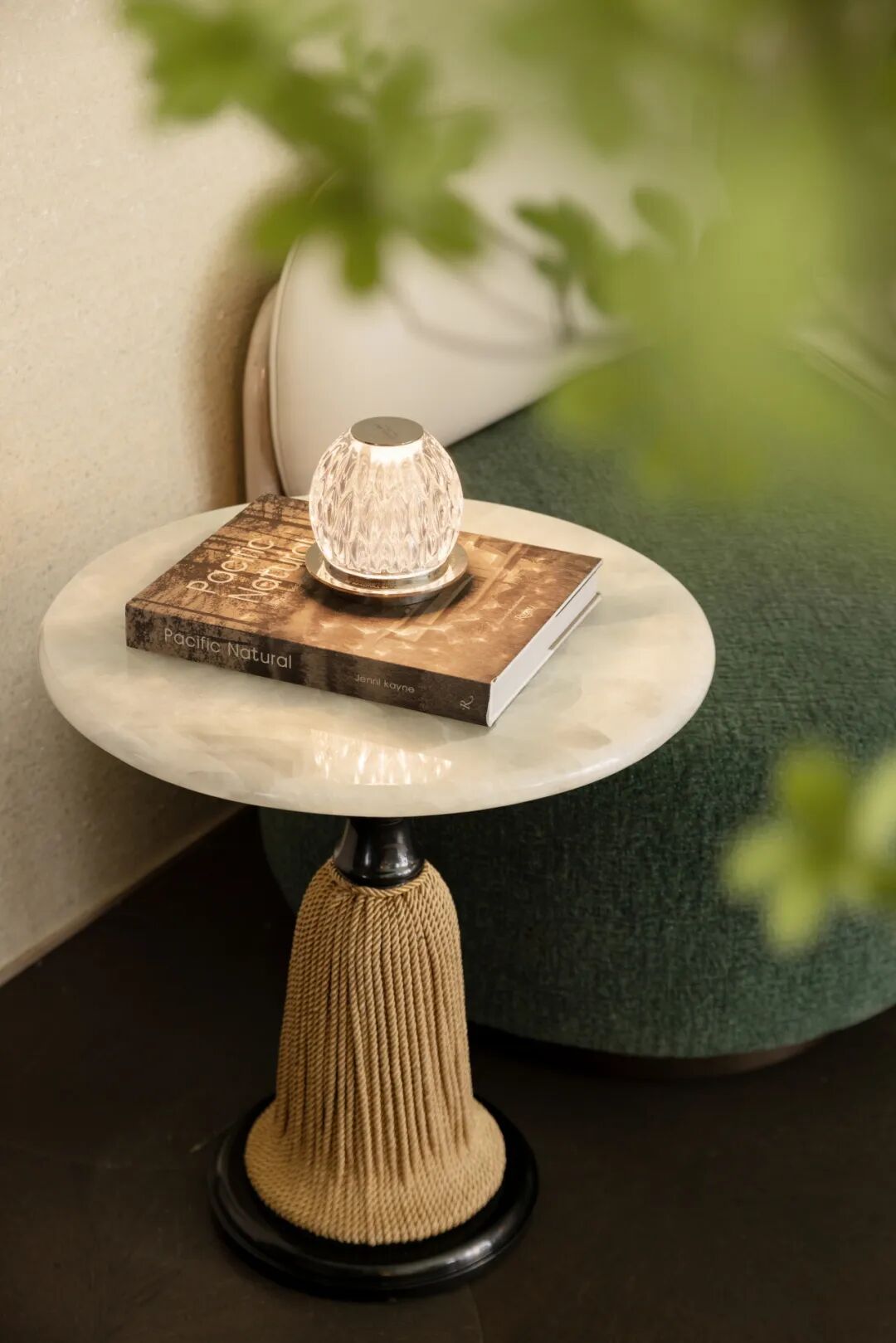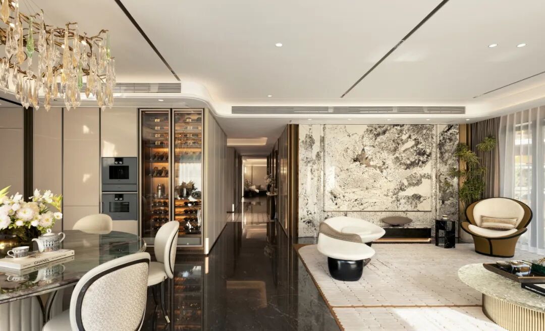 空间如一幅流动的现代诗卷,以开放式格局挥洒出无界的通透。视线无碍穿行,空气自在流转。一幅浑然天成的大理石背景墙,抽象泼墨式图案宛若凝固的山河,成为空间磅礴的视觉诗眼。墨绿丝绒沙发如天鹅绒包裹的绿洲,释放着舒适与尊贵的双重引力;BEBA扶手椅,雕塑般的造型和对细节的考究像盛开的花朵,邀请我们享受轻松且美丽的时刻。