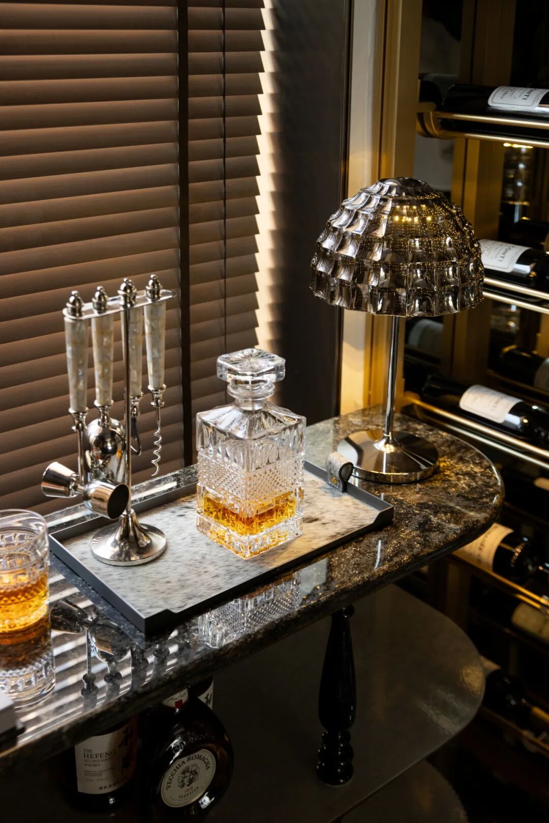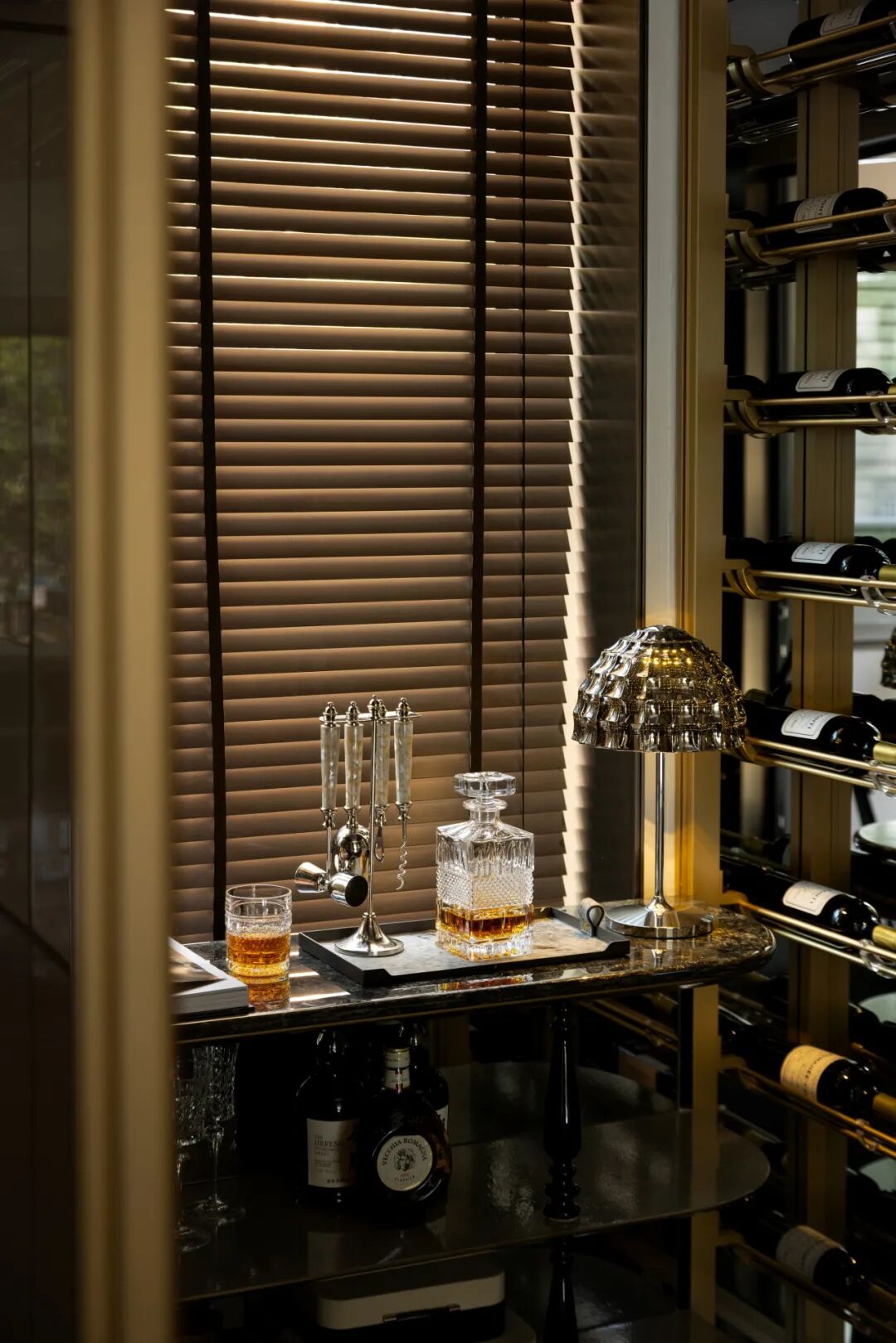 暮光之下,对称式酒柜将长廊空间的纵深感延展,打造专业储酒与品酒动线。步履深入,窗外透过的光打在酒液、器皿上,明暗交错间,传递出私密、沉静又奢华的品酒氛围,满足藏酒赏酒、好友小酌的场景需求。