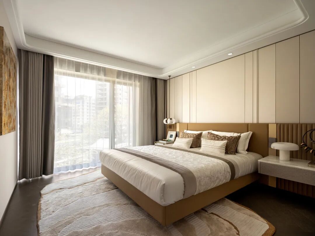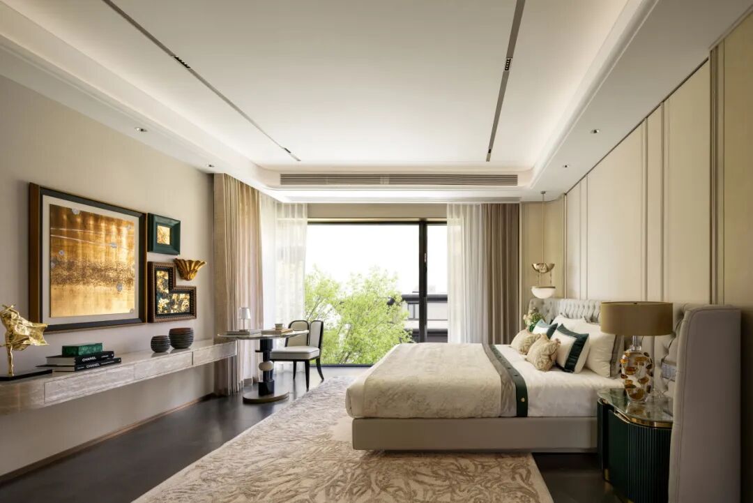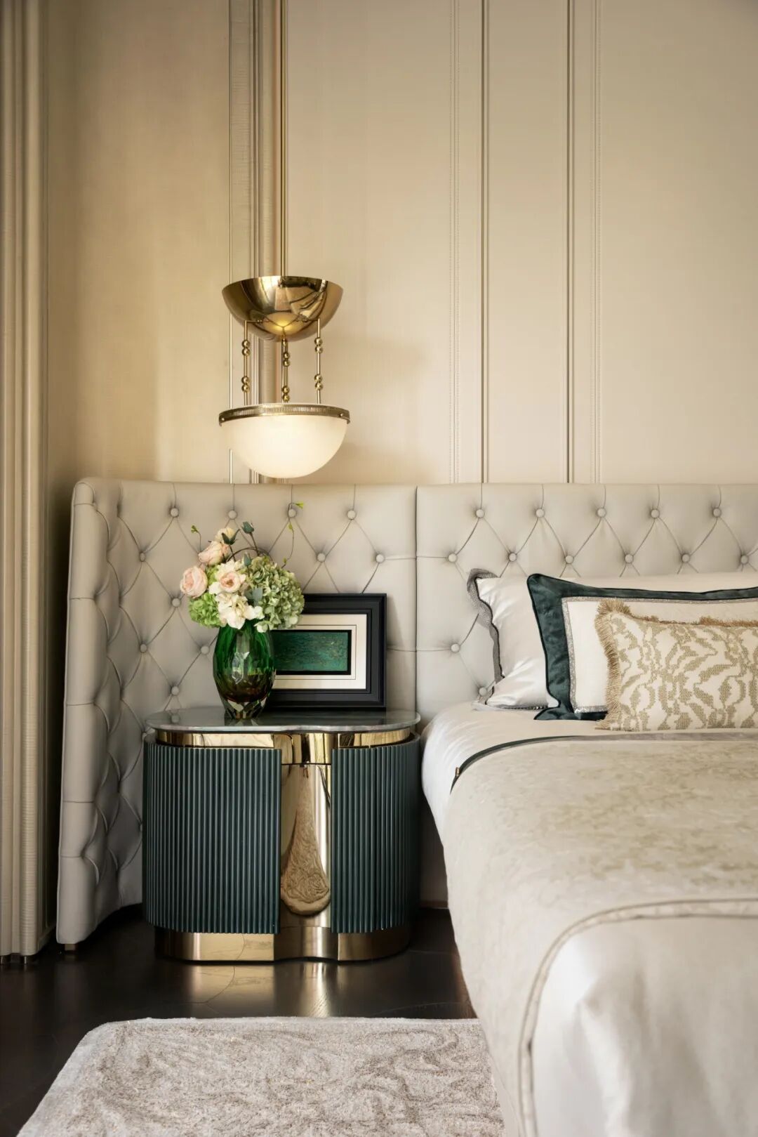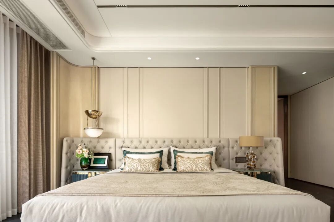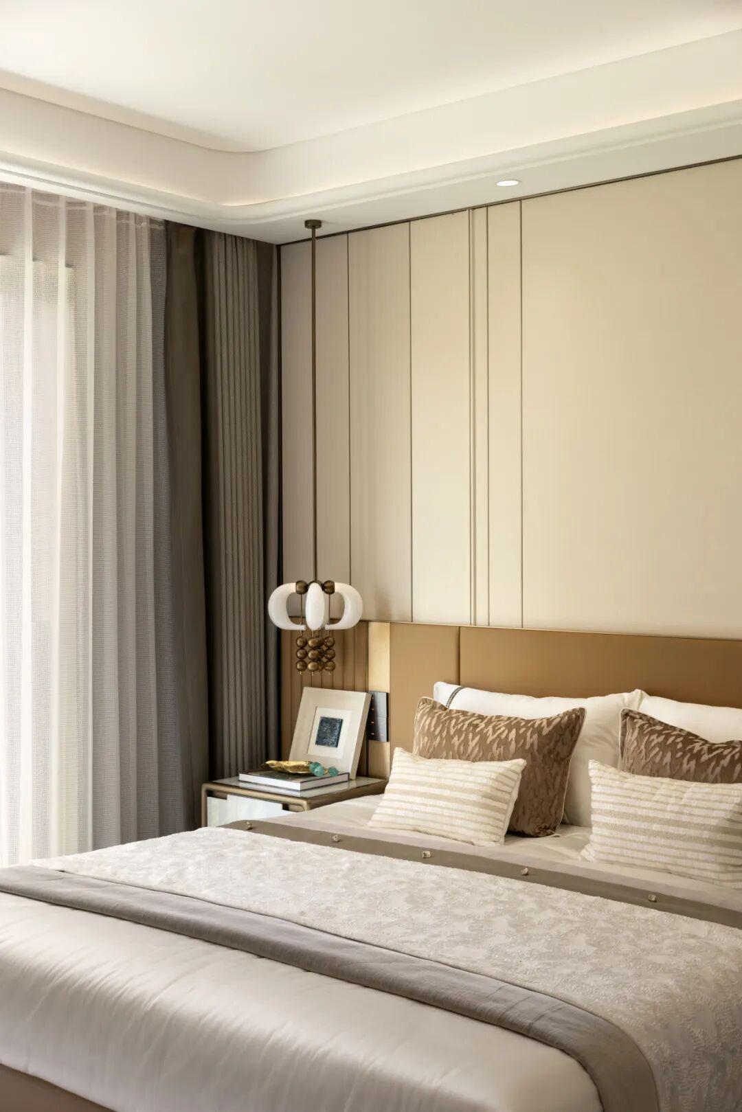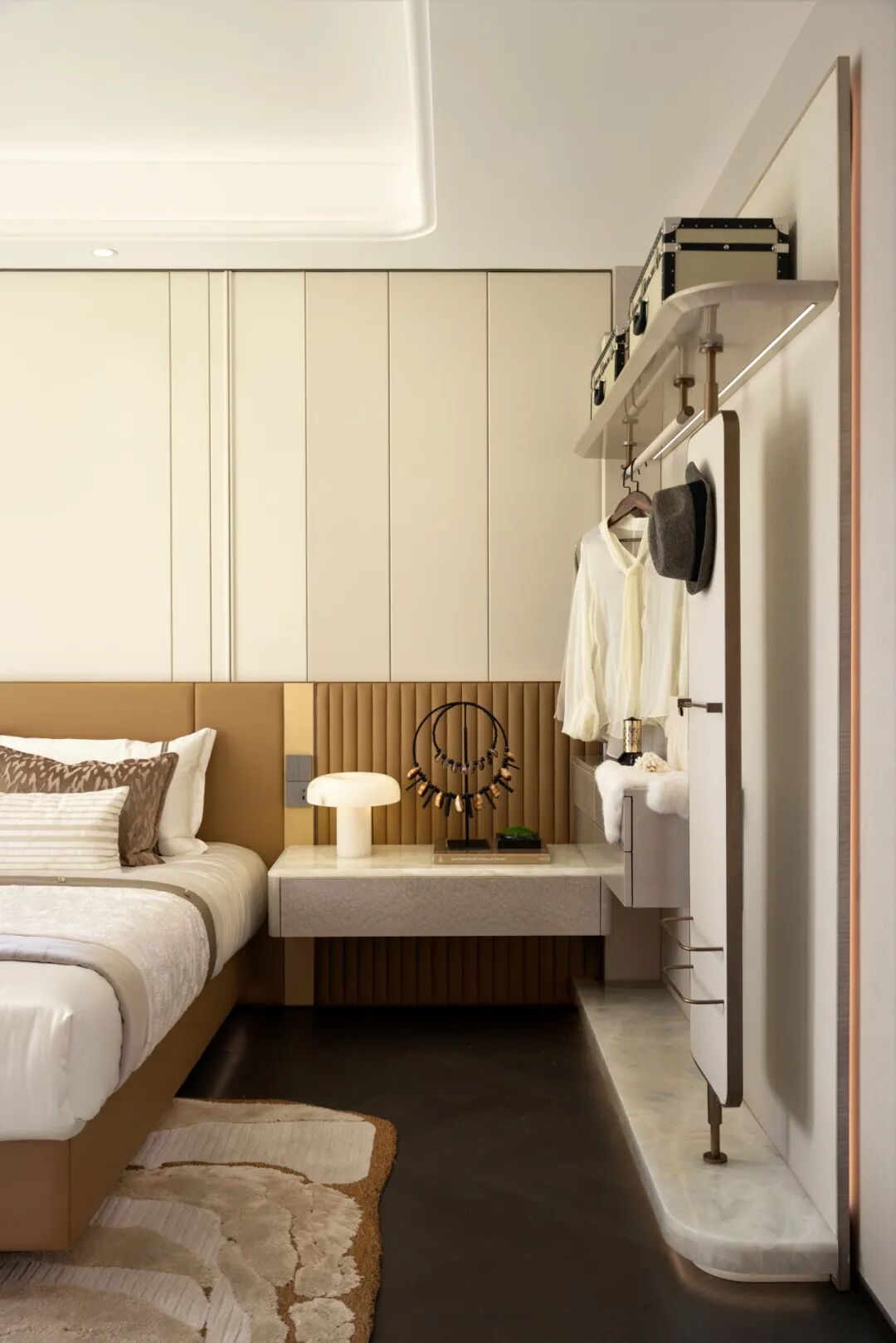 步入这座空间的核心地带,浅色调做为主卧房间的氛围基底,利落的天际线被线性灯光温柔勾勒,层次悄然晕开。