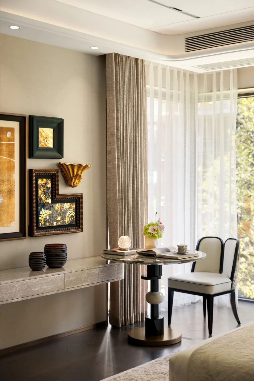 巨幅落地窗是光的引路人,任自然天光肆意流淌,串联起窗边沉思的书香一隅,如行云流水般自在。圆桌与单椅以优雅弧线温柔围合,色彩鲜艳的艺术挂画流淌着精致光泽墙,如跳动的视觉音符,与框入的窗外景致低语唱和。