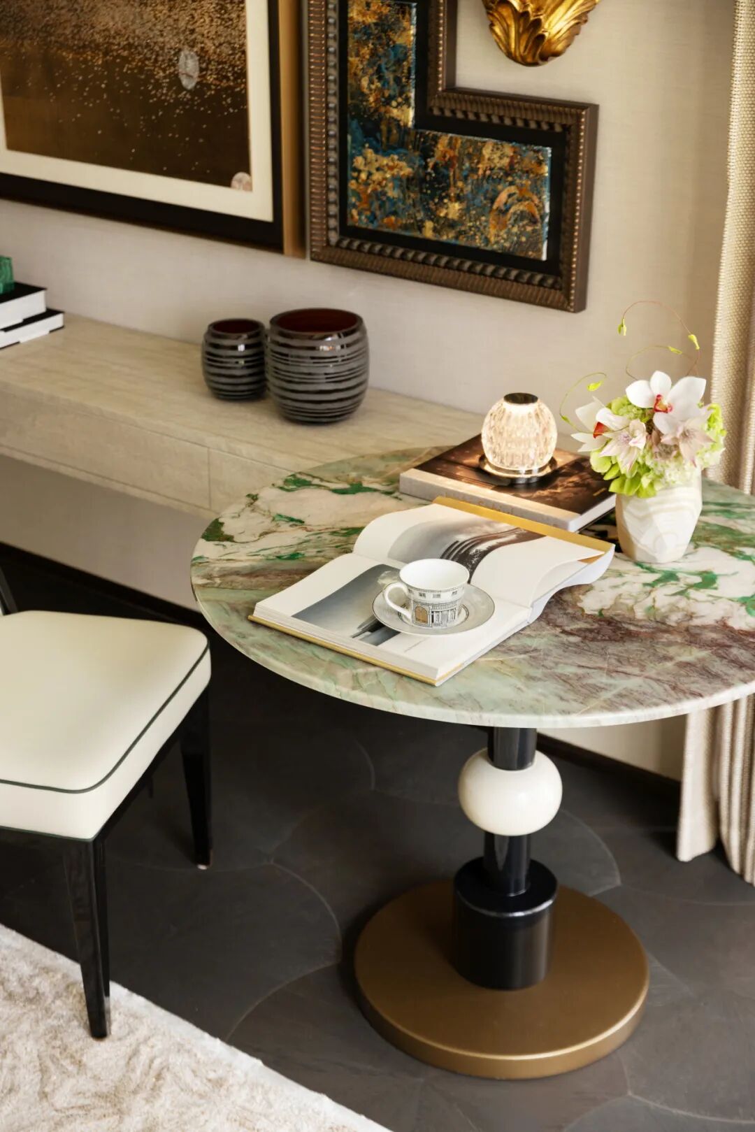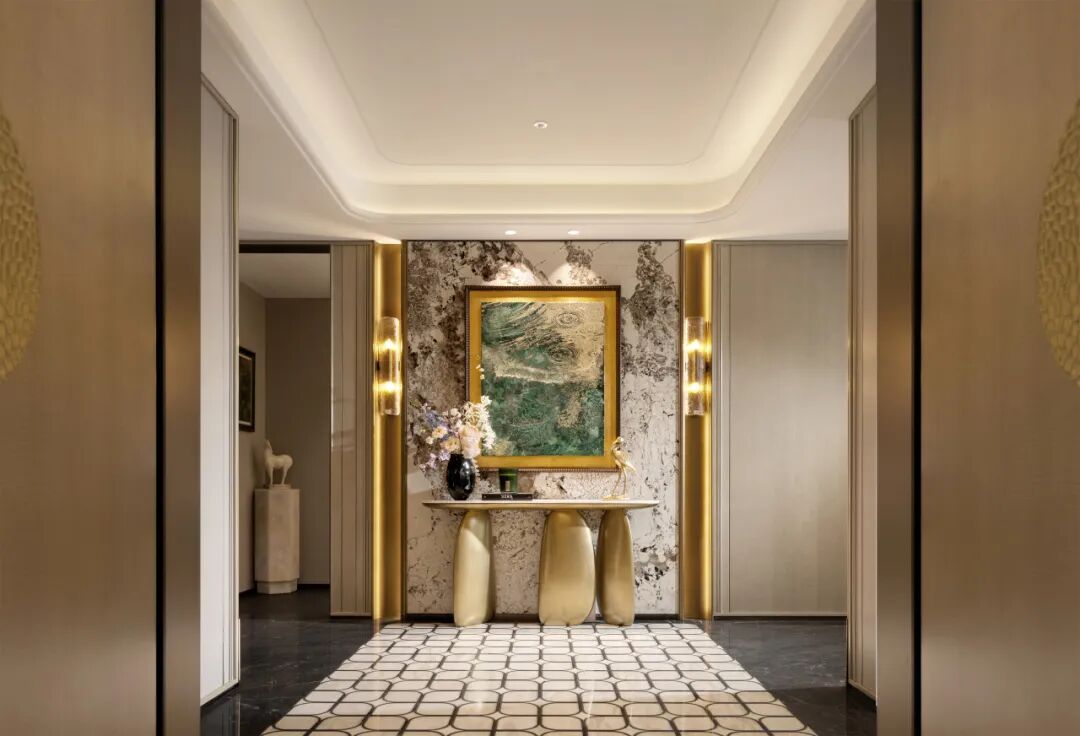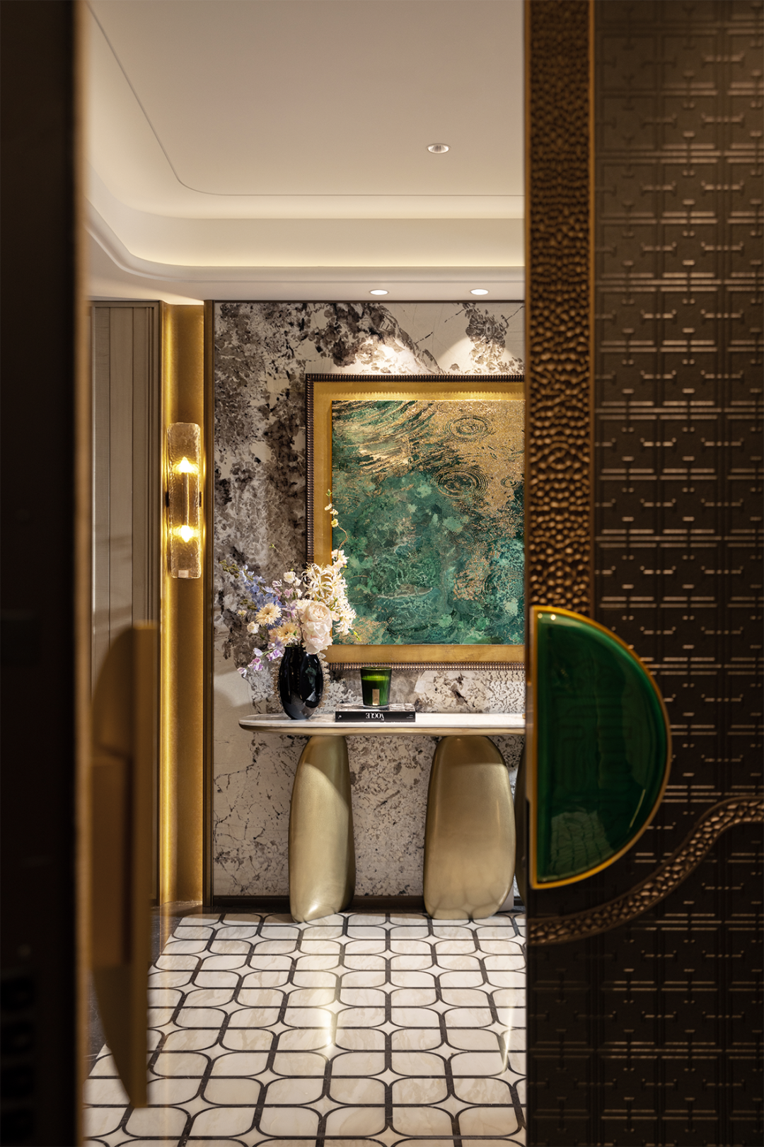玄关入户,金色元素与大理石纹理铺陈奢华基调。绿石壁画与水墨色大理石墙面,构成视觉焦点;浅色调天花板顶线性灯光映衬下,精致、典雅的艺术格调跃然眼前。上空光源精准投射于壁画与桌面,圆润弧形桌柱轻添一瞥俏皮意趣。