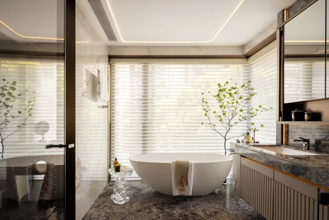 卫浴间,陶瓷的洁净光泽、金属的精致镶边与云石台面的天然纹脉相映成趣。 通透的沐光秘境,纱帘滤过天光绿影摇曳间,共同将日常的休憩与梳洗,升华为一场关于精致生活的沉浸式艺术体验。