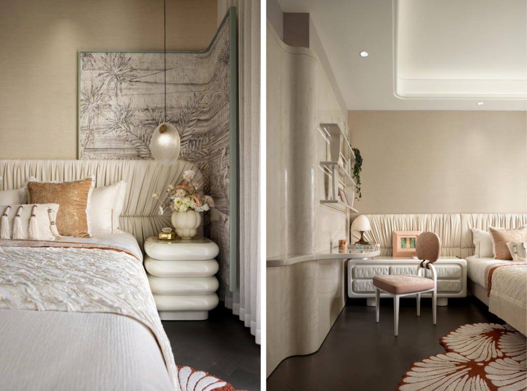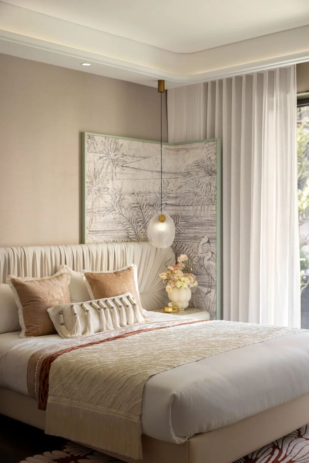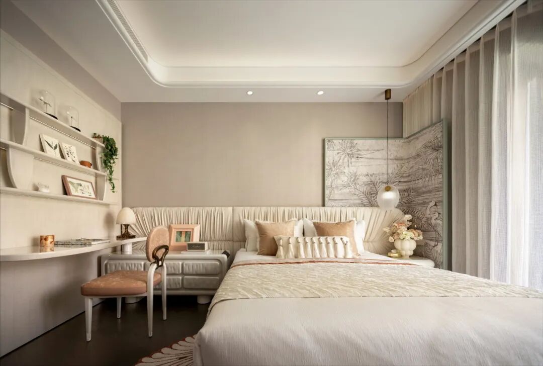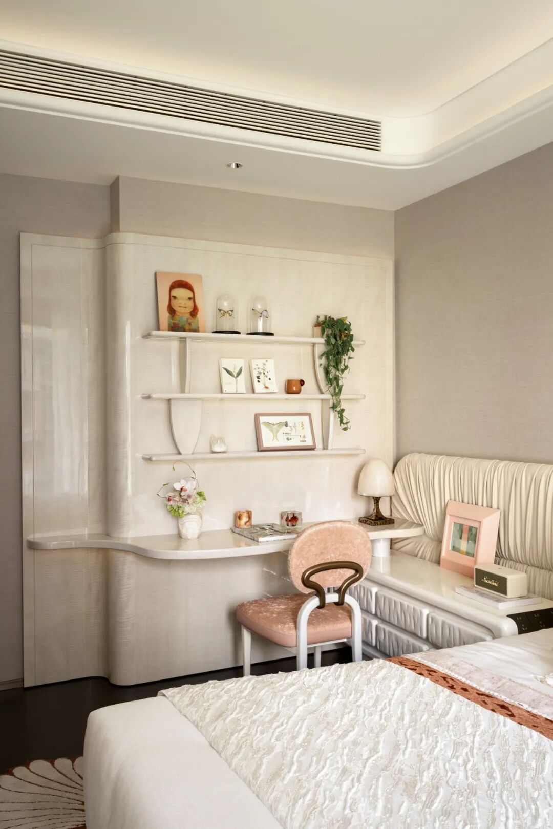 床头艺术屏风蔓延开枝叶藤蔓的意象,将自然诗篇引入室内,柔化空间边界。软包床榻褶皱如公主的少女裙摆,优雅且高贵,浅粉抱枕与流苏腰枕轻缀其上。小巧的床头柜与书桌,以纯净白勾勒简洁轮廓,一袭弧形座椅,以柔美曲线呼应法式优雅,为日常添上一抹芭蕾般的轻盈韵致。
