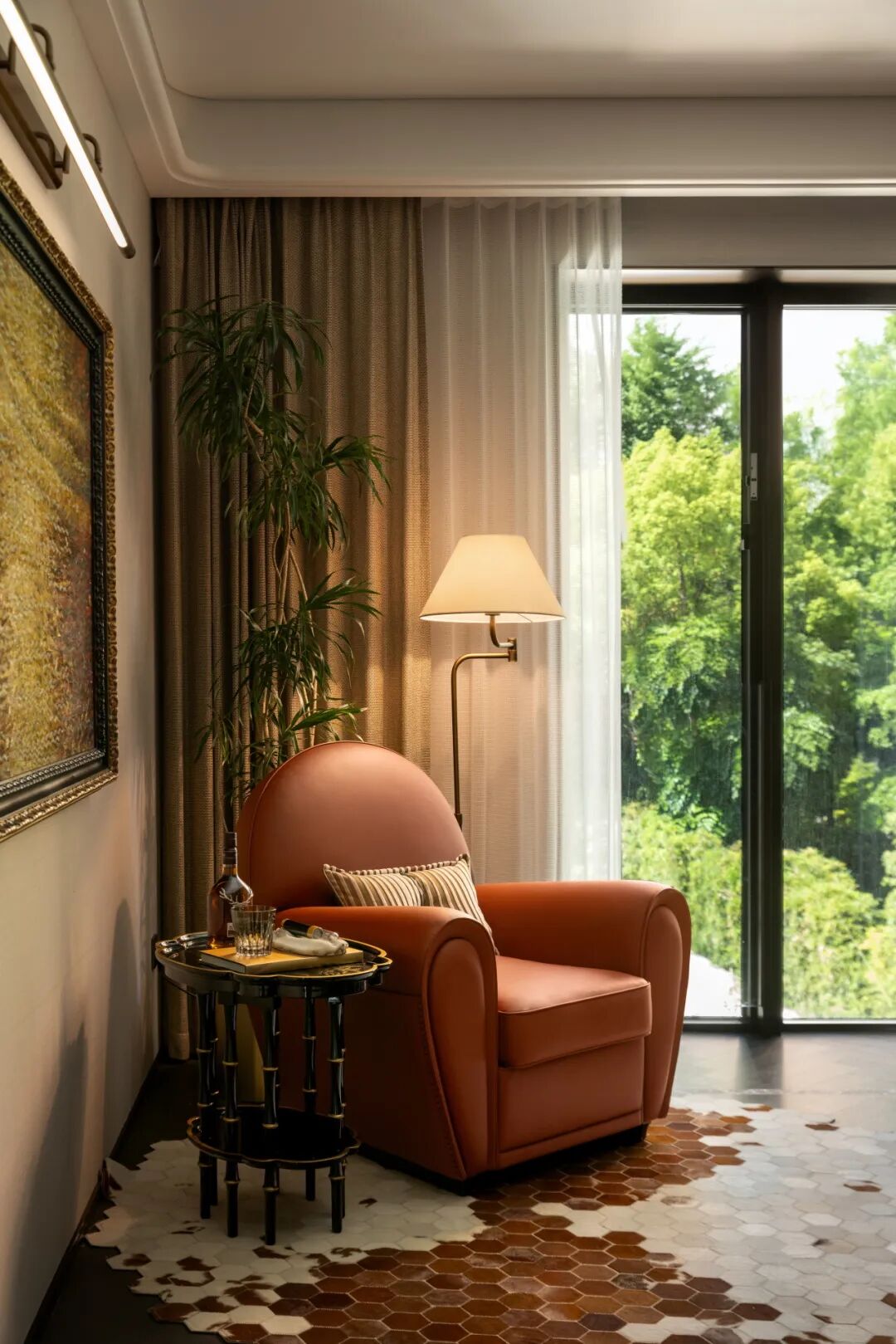 着眼于私享空间,现代精神与复古情怀在此欣然共舞。墙面化身流动的美术馆,组合挂画与装饰构筑视觉的诗眼。一抹靓丽的复古红,皮质感单人沙发椅造就一方私密岛屿。