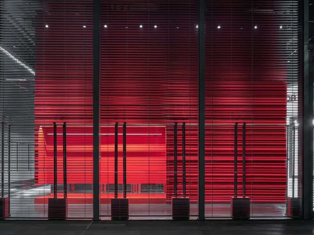 红色立方体静立于店铺中央,一面平行于商场临街玻璃幕墙,另一面以侧视角度面向商场内次入口,强视觉冲击力令其在整体纯粹灰色的冷调空间中成为艺术装置般的存在。