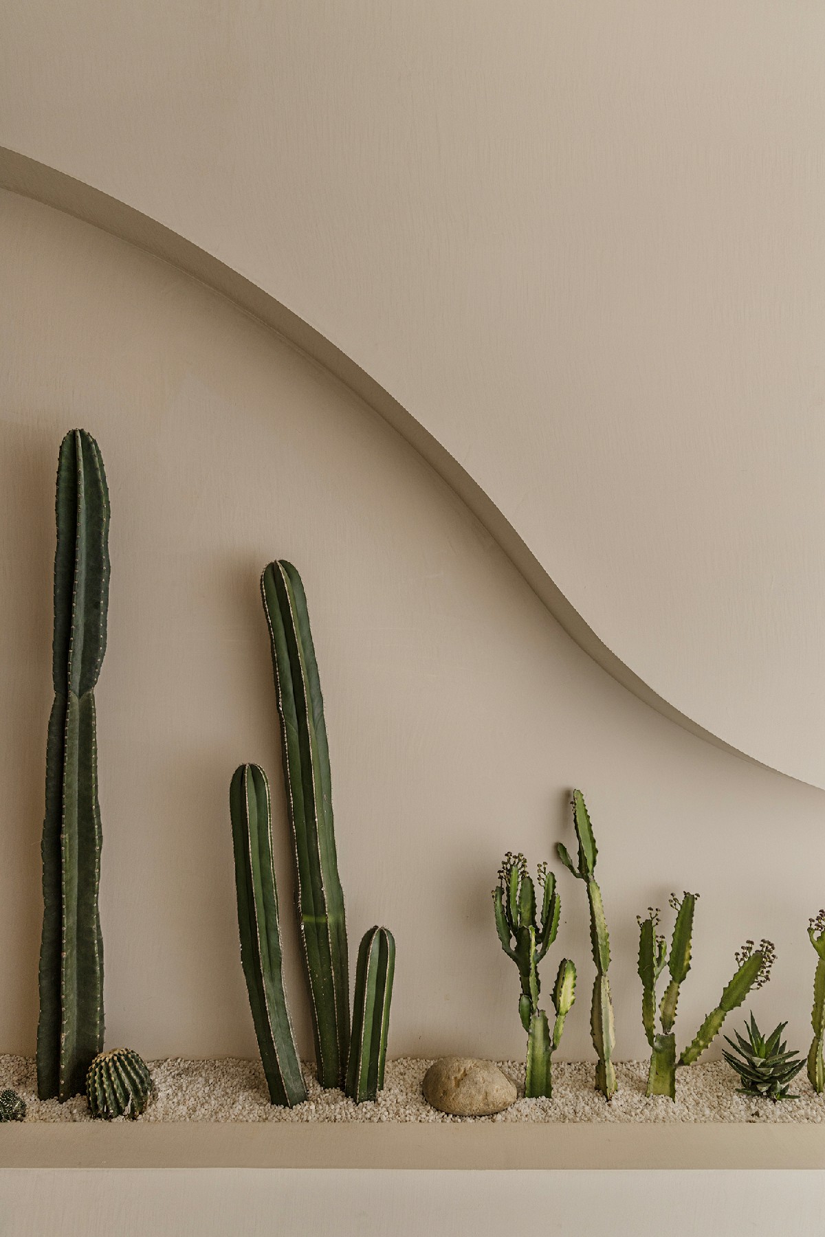 延续一楼植物自然生态架构,简洁铺陈创设新颖且带有平面意味的体验感。仙人掌、多肉植物等自然元素,唤醒人对空间的觉知,于每个细致末微的角落渗透静谧气息。