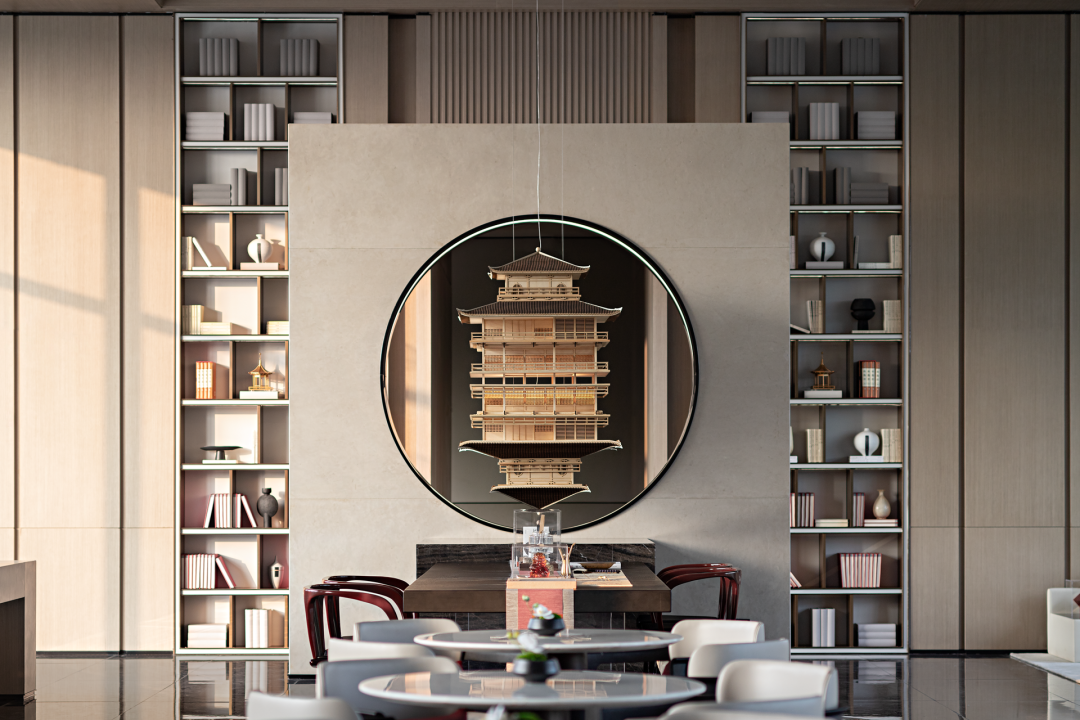 洽谈区深度还原书院式设计的精髓,以对称整齐的中心设计线条搭配大面积的木饰面,营造出厚重朴实的空间质感。岩崎孝宏作品《反射模型》融入中国古代建筑艺术与现代建塔艺术,结合传统亭台在池塘的反射,作为三维镜像在空中神奇地盘旋,极具张力与艺术美感,展现出层次丰富的美感。