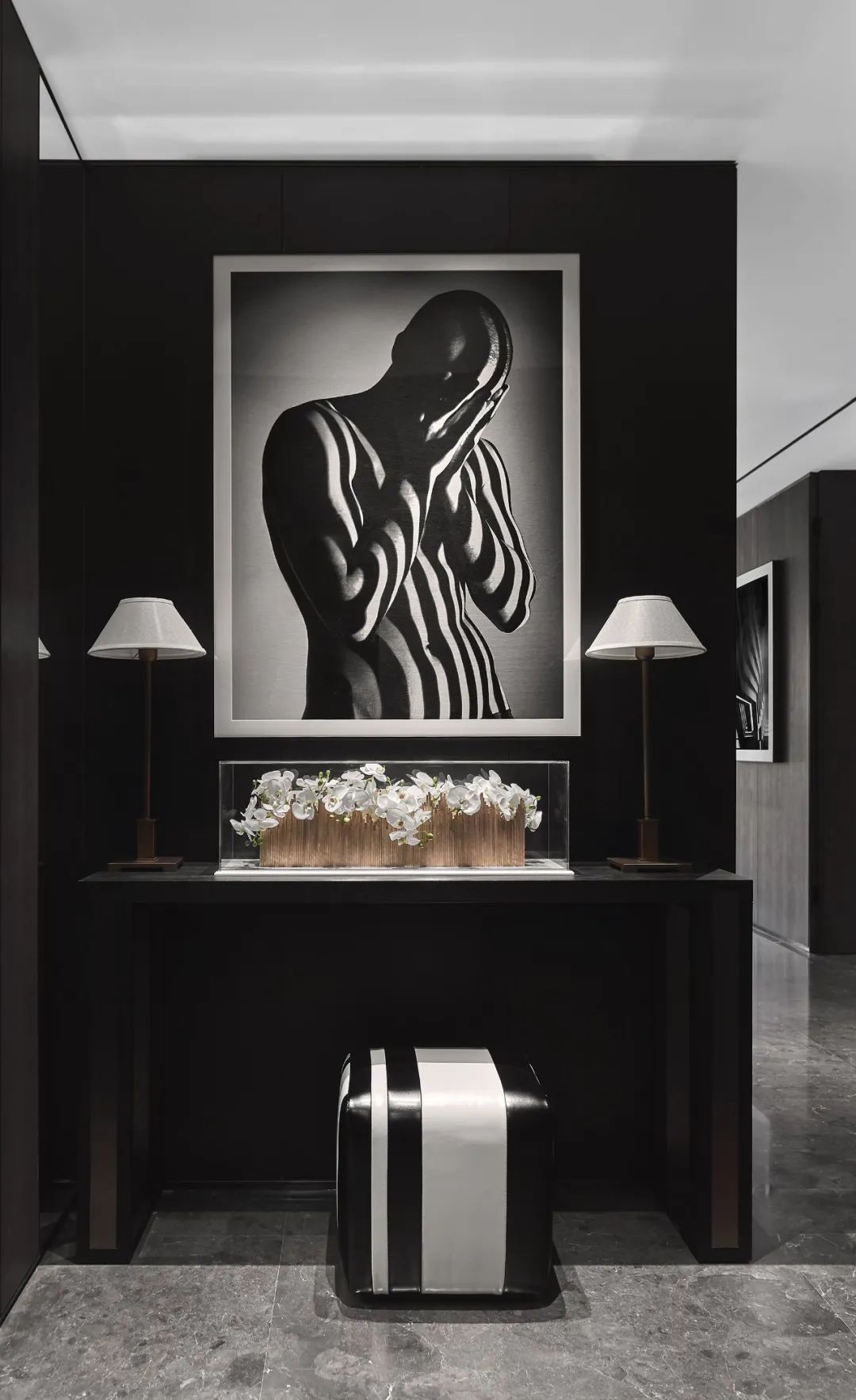 在本案中,设计师以黑白灰的色彩语言铺叙自由的艺术,构建起一幕幕触动人心的美学场景,通过明暗两条主线:一条是结构布局与审美视觉的交融,另一条则是空间精神层面的升华与塑造,从摩登都市的隐喻中,提炼自由的姿态和包容的特性,探索都市生活方式的内核与本质,匹配居住者的多维高度,刻画“都会生活新样板”的核心 —— 不拘形式的艺术,兼收并蓄的摩登,以及自由丰沛的精神。