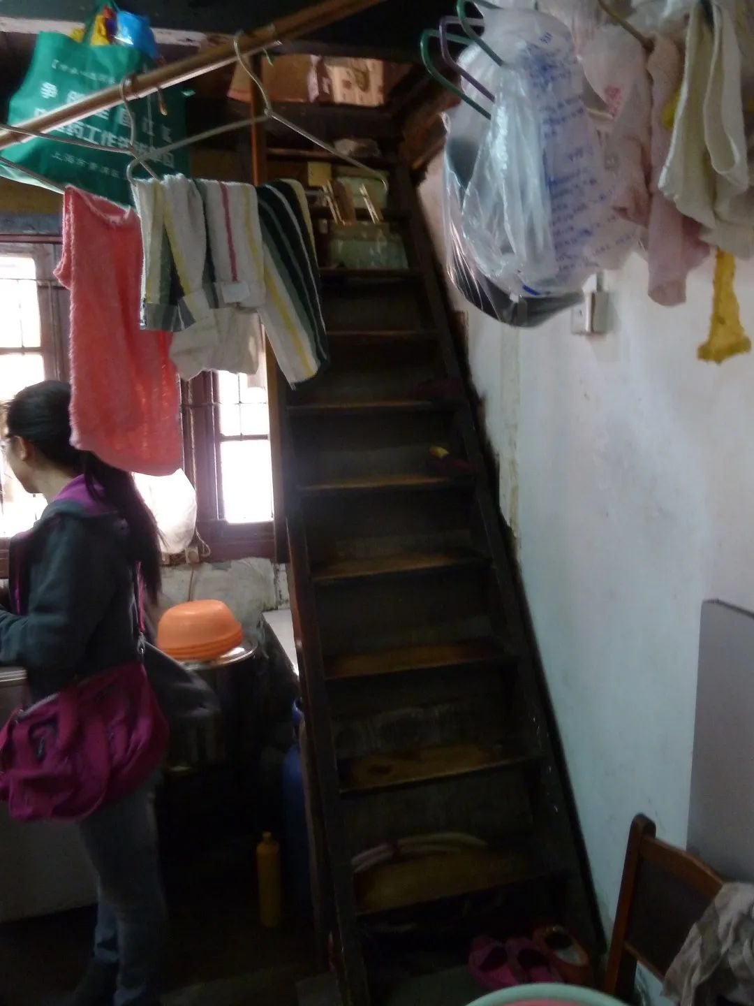 这是一栋有着100多岁的老房子,梁柱墙体肉眼可见变形倾斜,房屋结构极其复杂,一楼商铺占据了大面积使用空间,要去往户主的家,需经过长达17米的“深井”通道。进入后,人要通过70度的陡梯,达至2层卧室区域。