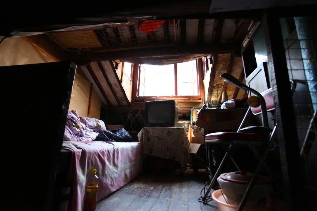 在这间20㎡的空间里,一楼是包馄饨的场所,二楼和三楼是居住空间,且同时容纳着两位年逾80岁的老人及儿孙三辈,屋内没有厕所淋浴设备,起夜只用痰盂解决,三层阁楼没有天窗,人很难站直。