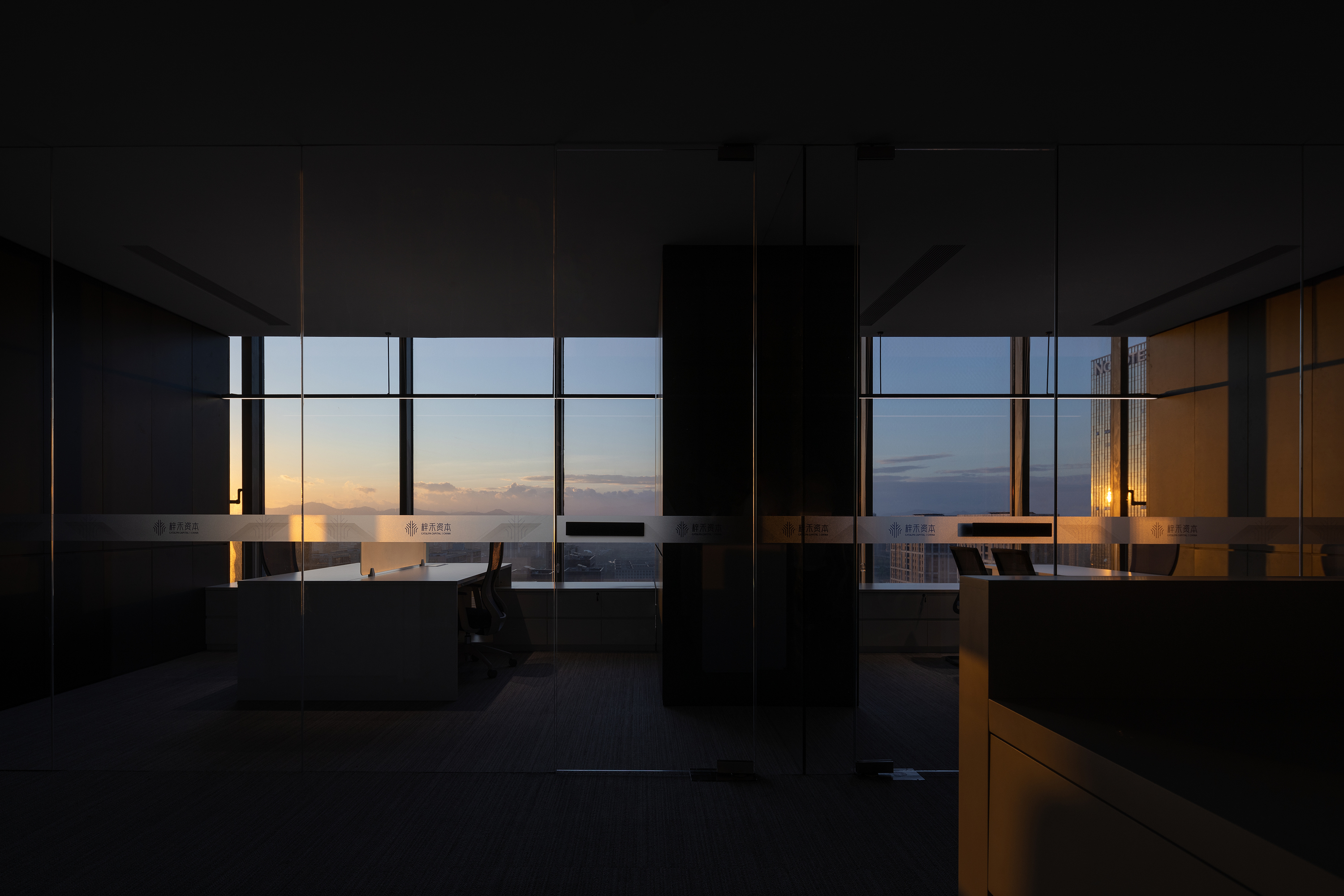 在欧硕律所的设计中,建筑空间有整排的落地玻璃大窗,可一览壮观的城市风景和四时变幻,光线的变化非常丰富。这个项目让我印象最深刻的是,在某次与业主的沟通中,我忽然顿悟,这个城市总有一些人,用自己的智慧和态度,守护着城市之光。那一刻,我就想放下设计者的姿态,用最简单的黑白灰,让“理性之光”和“自然之光”成为空间的主角,以此致敬这群用法律守护城市秩序的人。