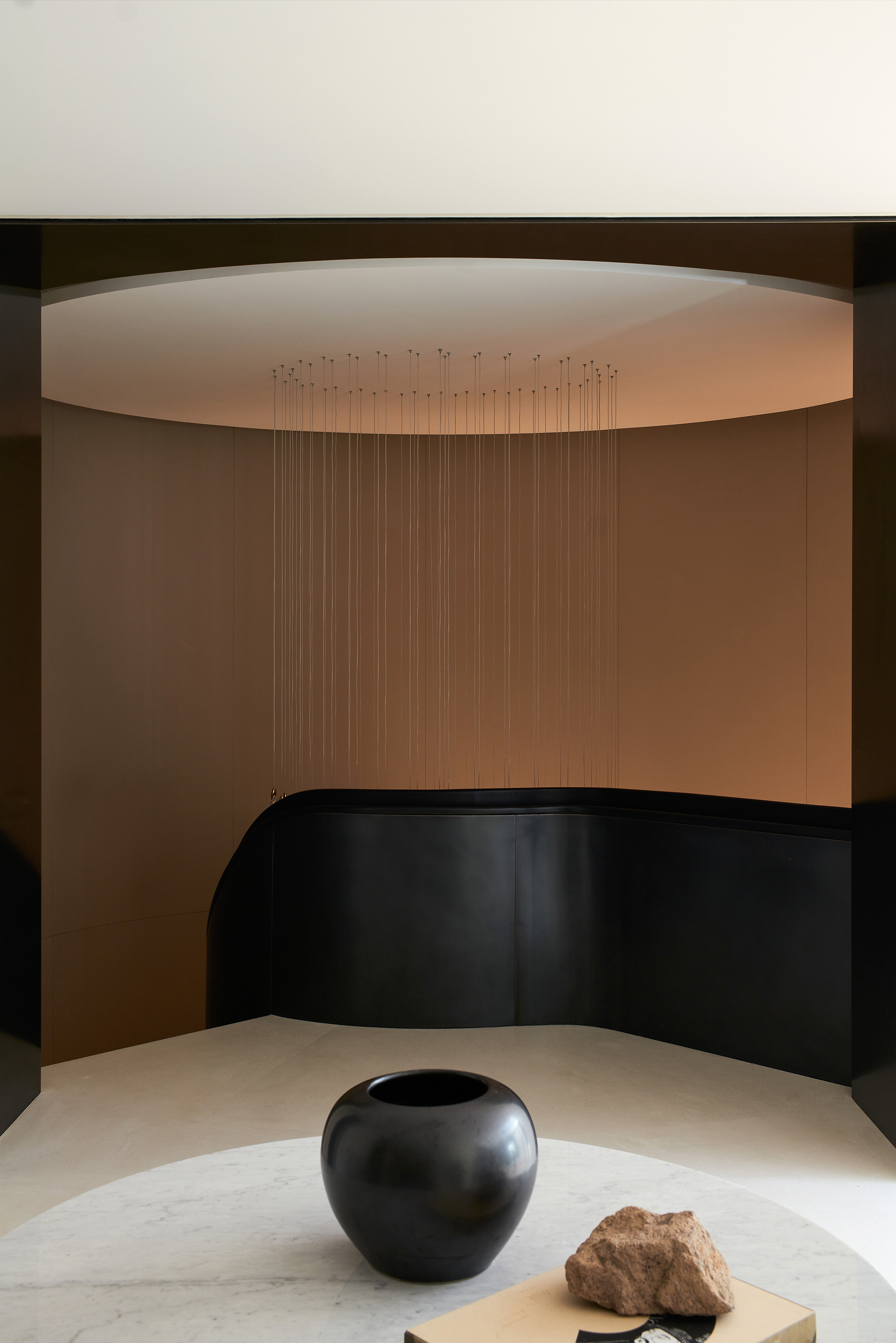 如何通过设计去塑造一个东方品牌,这让我激动而兴奋,我想了很多表达手法。直到有一天,我看到业主发来的他在晓云山居别墅的花园和父母一起吃早餐时拍到的东钱湖的日出,和开车回家时遇见的壮观的夕阳,给了我全新的灵感。一天的开始,是爱的开始;回来时,有温暖的归宿感,与宇宙的光芒同频,便启发了我们的设计概念 —— 乐为人梯,辅佐向上,传递美好的生活方式。