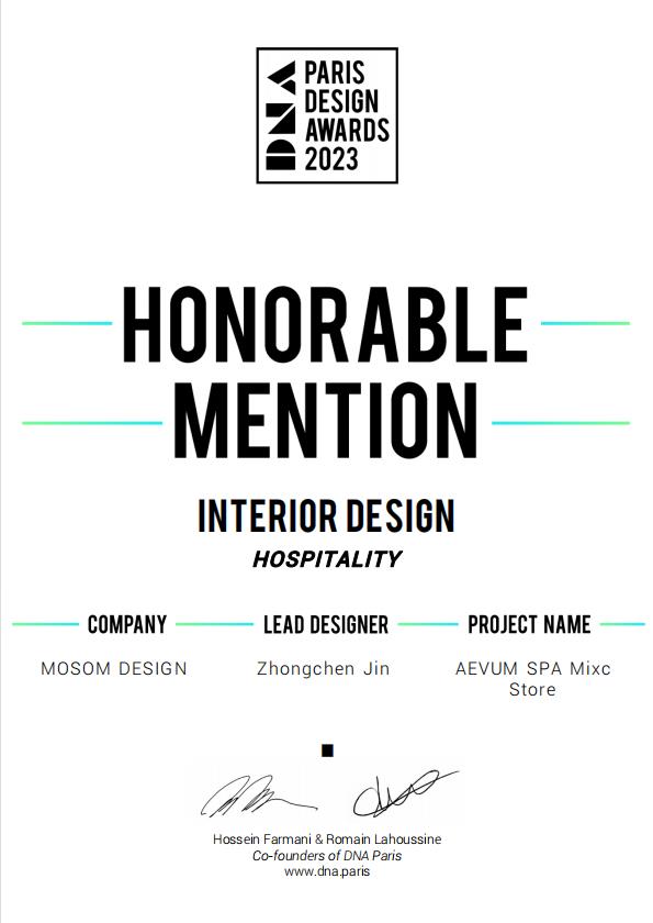 Recently, the DNA Paris Design Awards, a global renowned award which received much attention from the industry, has announced its 2023 winners. With its "new aesthetic design" that is diverse and elegant, MOSOM DESIGN, a top design company in the pan-beauty industry, has been awarded HONOURABLE MENTION for its works "Glass Palace Spa" and "AEVUM SPA Mixc Store."