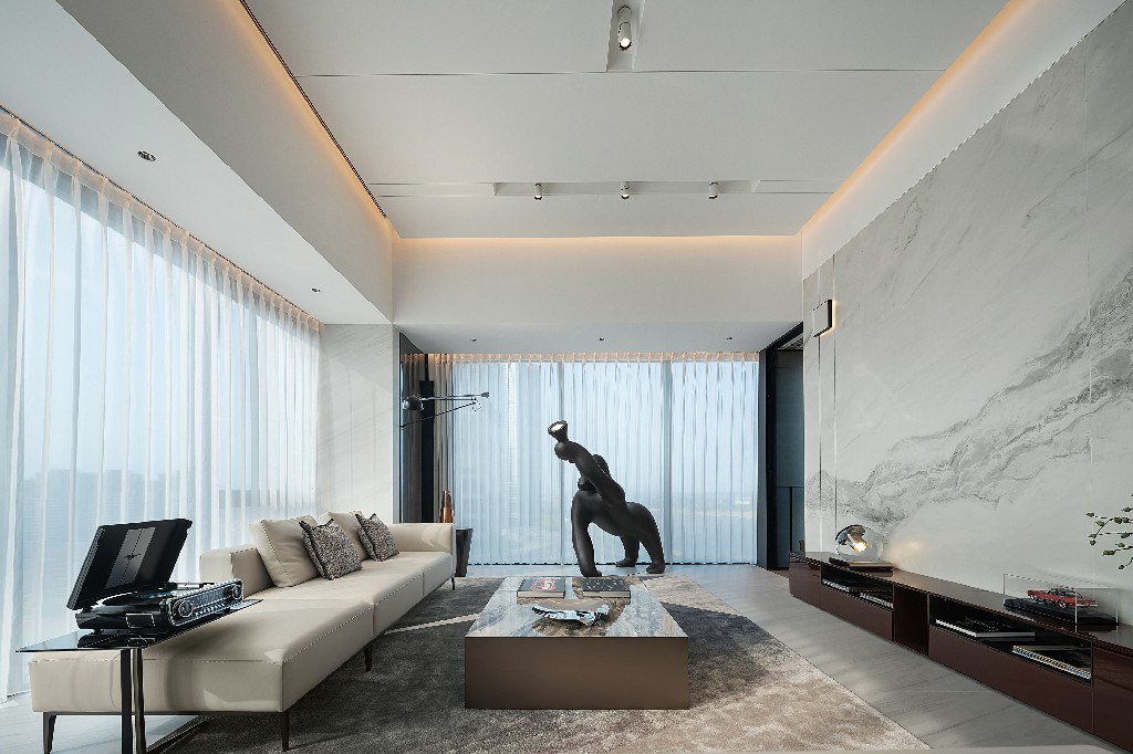 在休闲宜居的珠海,WED中熙设计以湾区城市群的发展眼光,围绕海滨居所的生活方式而设计,更迭高品质的生活语境。基于这种人居需求,设计师汲取山海意象特点,以自然景观与优雅艺术气质为笔触,勾勒出顺应城市气质与自然肌理的浪漫生活廓形。随着线条伸展的方向,空间力量乍现,空间感与节奏感不言而喻。