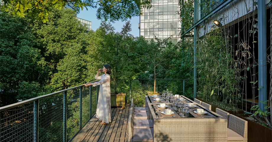 潘高峰先生的办公室位于宁波高新区华之大厦,驻足于楼下,便感觉到身心被繁茂的自然环境包裹着,在朝九晚五的都市中沉浸于“诗和远方”。步入内里,则江南风韵更浓,茂林修竹,翠意深深,予人自然与生活、工作的无界体验。