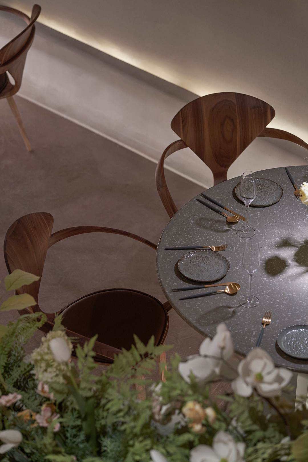 为尊重UNBN酒店的运营理念以及Le Coq餐饮品牌的风格特质,RooMoo设计借原有竹架的材质以及功能,通过精致化、打散、重构的手法结合,并与其同型的金属条,使自然延伸至餐区的每一个重要的角落。与此同时,借“自由”散落在空间中大小不同的圆形可变氛围灯,客人可在不同时段不同空间位置,捕捉到不同的视觉体验。
