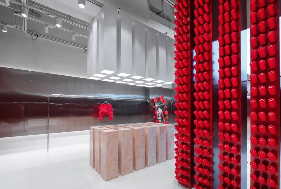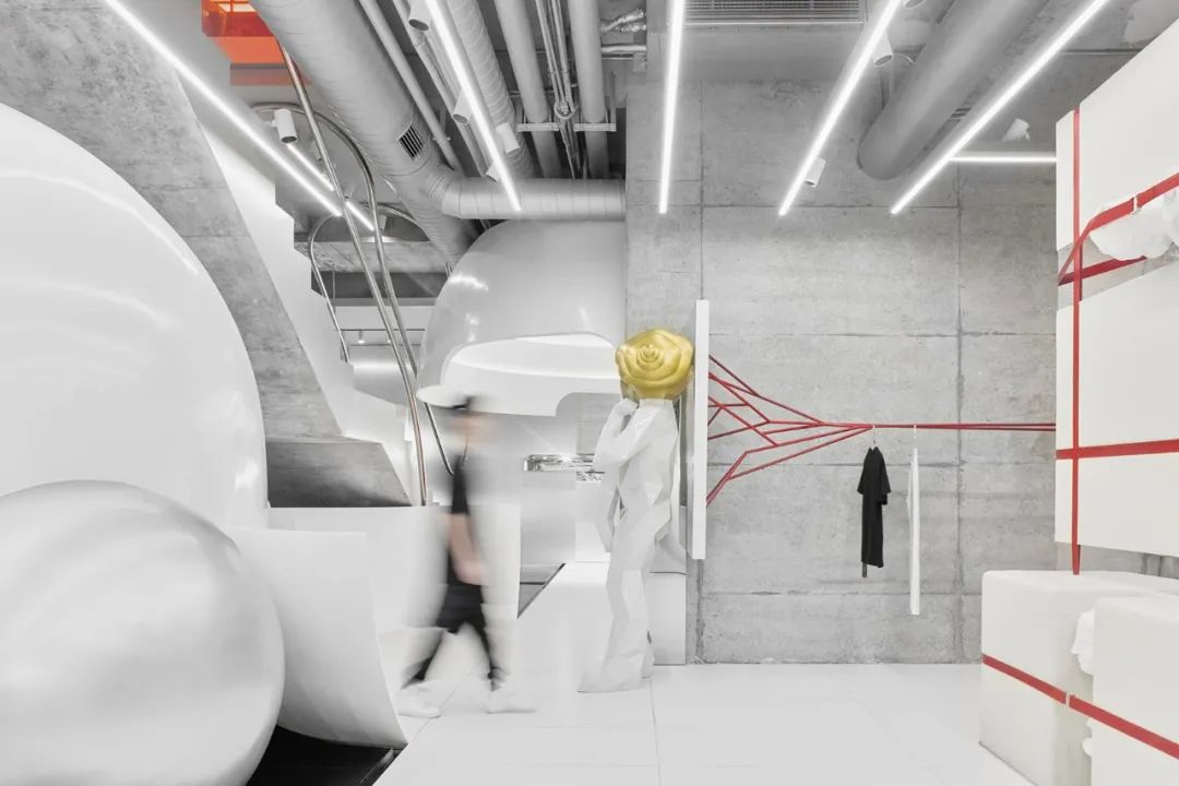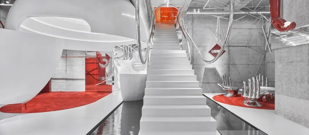 在Conemoting Market看来,随着年轻消费群体的扩大与需求的进阶,店铺从单纯的零售空间、生活方式载体转化为社交场所。延续这一商业逻辑,叶梹室内设计赋予了这个580m²空间一个全新的盈利通道。在这里,科技感营造的前卫空间氛围,让新生代自我表达的欲望尽然释放;颜色,物体,光线,声音所集聚的张力形态,宛如一个第二世界,盛放着科幻、欲望、寓言、经典等叙述语言。可以说,整体空间的创新设计手法,既突破了传统零售实体店的边界,更折射出商业生态多元化的进展。
