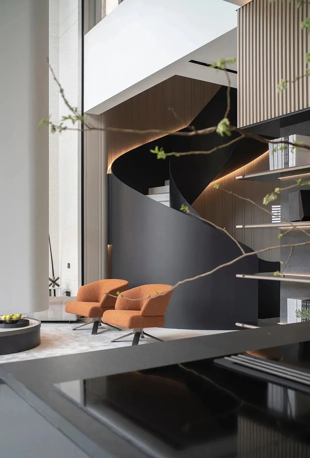 在本案中,设计师秉持一贯的极简设计理念,采取去繁从简,追求极致的设计手法为空间增添更多的实用机能,赋予其充满设计哲学的生活美感。爵士白大理石与黑钛不锈钢板、石盘般的书架结构、光影重叠的旋转楼梯,在层次递进与回旋中,感知静穆与灵动的相融共生。