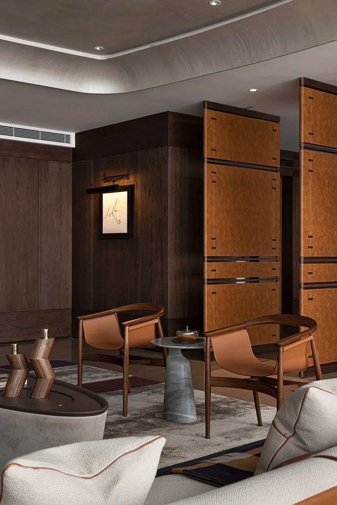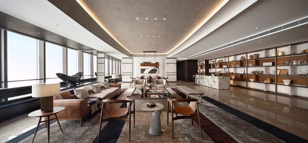 九龙仓长沙IFS屹立于长沙城市核心,其主楼72层平层的设计以“双城记”为灵感,以高奢品牌“Hermès”为主题,倾力打造“Sky Villa”系列空间,用设计重塑高奢经典概念,打造中西美学风雅之境。定制马鞍型座椅器具呼应主题,皮革、木材与古铜的创意重组融入精致典雅的氛围中,兼具东方禅意与西方抽象艺术之美,将奢级优雅与国际时尚的大气,镌刻于一室之内,以极致细节,彰显豪雅大宅魅力。