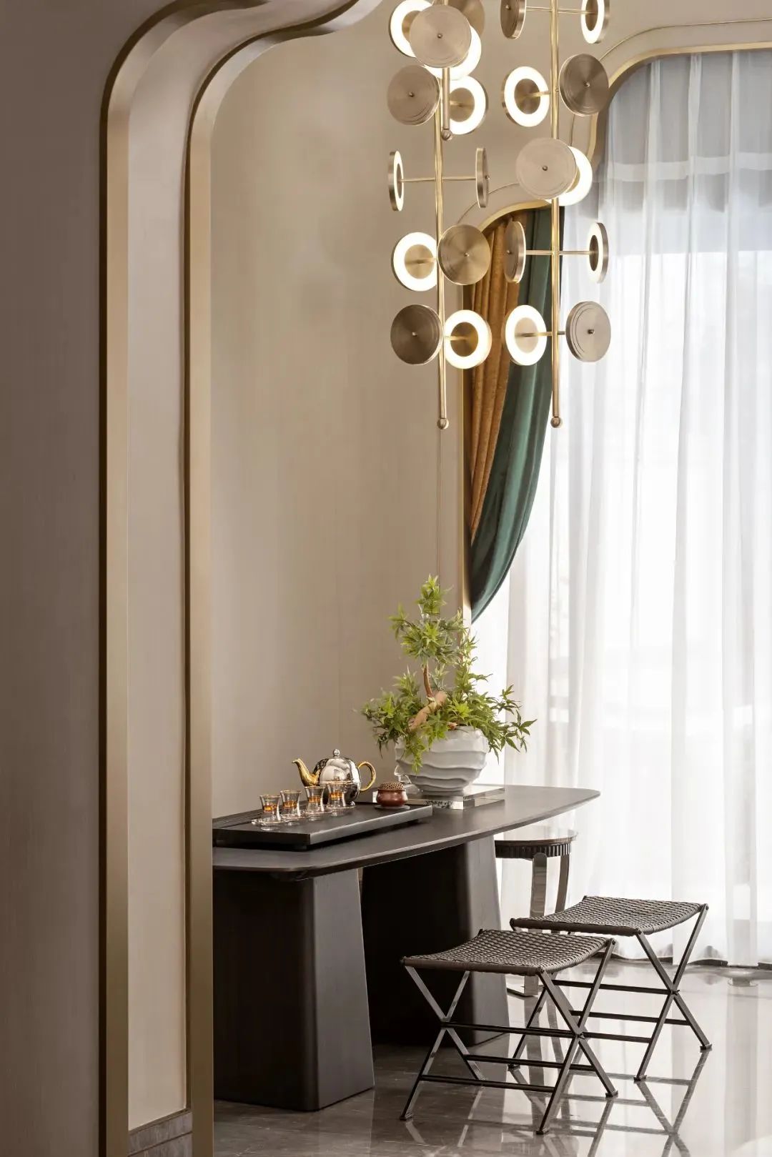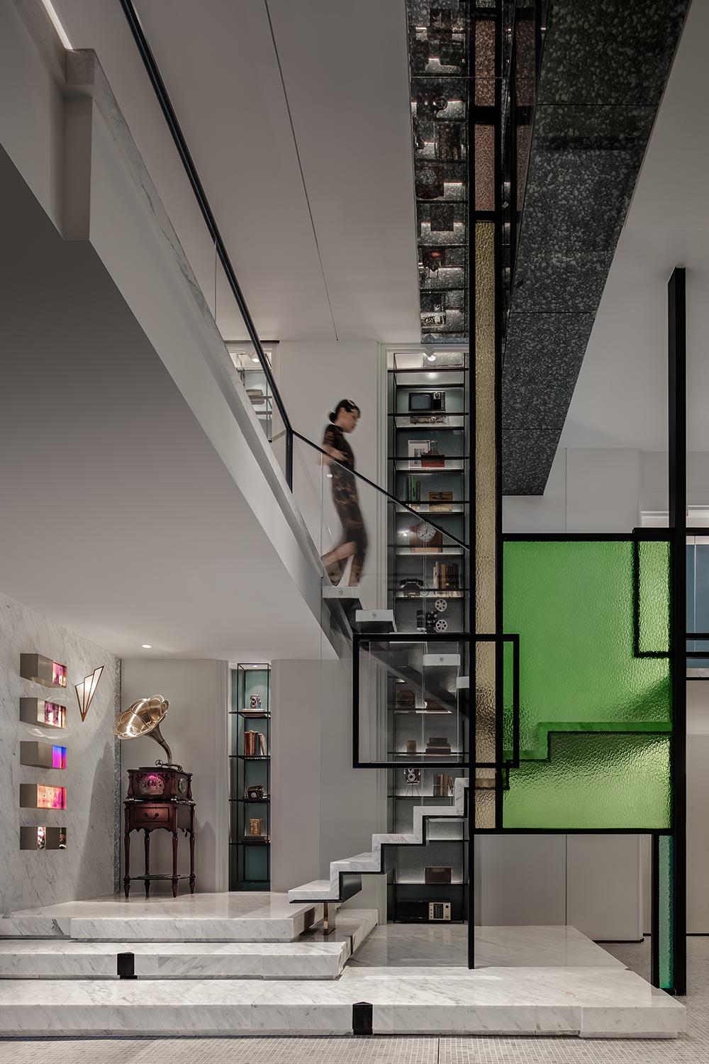 在本案中,设计师融汇复古的装饰艺术风格与现代的设计语汇,于摩登时尚中透露东方的端庄典雅,在流动的细节中雕琢创新与融合。鲜明的色调与富有质感的金属升华空间的整体气质,几何造型与蜿蜒生长的线条描绘出理性与自由的平衡,留声机、自鸣钟等唤醒跨时代的记忆,寻绎着民国纷繁与鎏金岁月。
