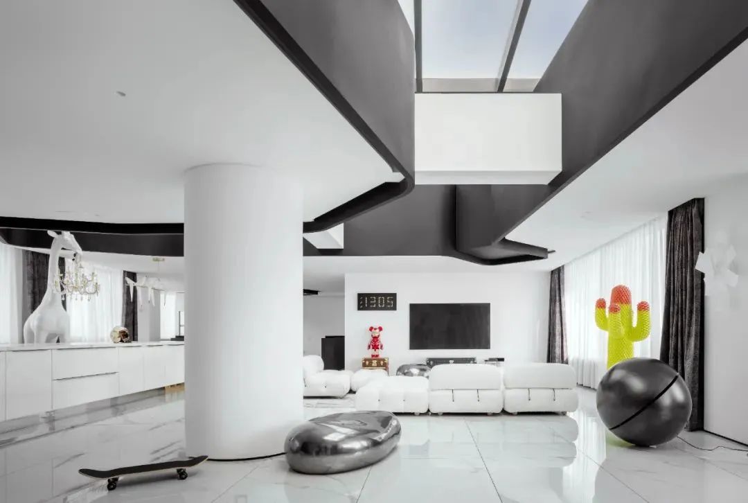 在这个650m²大平层中,于强以及异开设计以更年轻、先锋的理念回应业主崇尚自由共享、追求艺术时尚的精神需求。其应用“片段式”手法,以叠加、重组等手法再造了空间秩序,通过非对称、立体、圆曲的布局,创造出超越具象主题概念、而又在温和微妙中体现真实生活的艺术度假私宅。