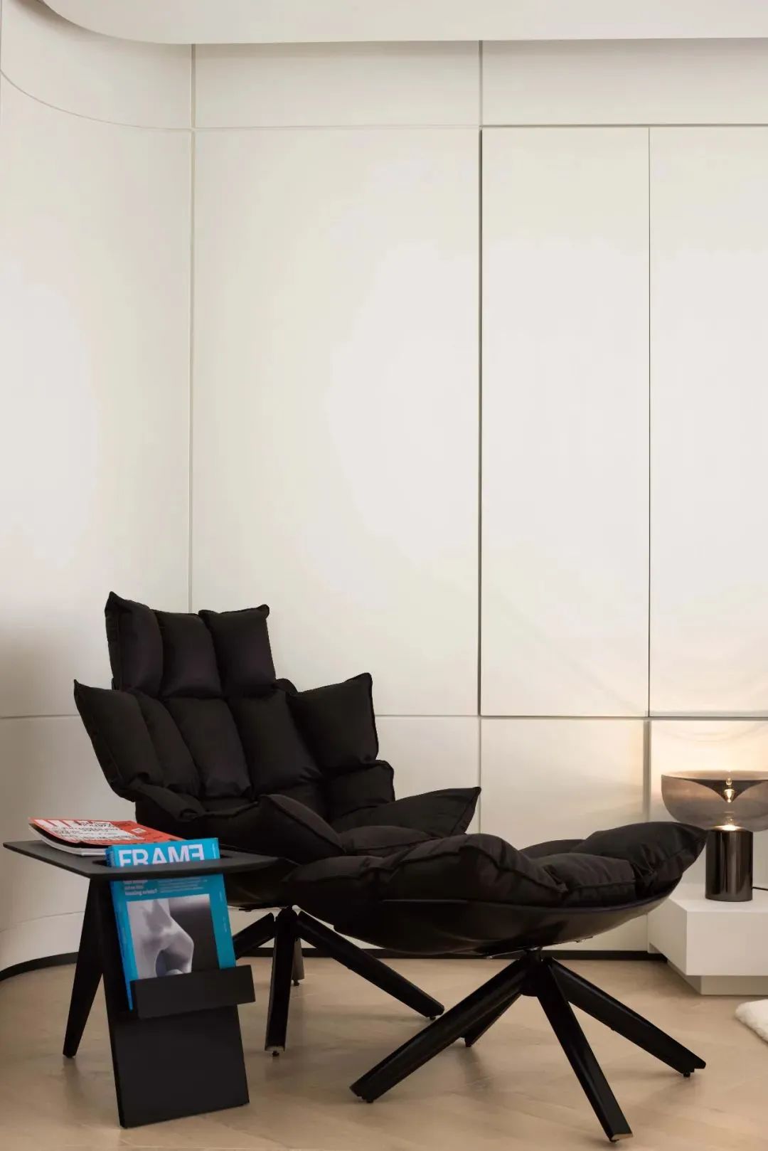在本案中,面对格局零散、局促的650m²大平层,设计师并未大尺度重整结构,转而选择在视觉层面应用“片段式”手法,采用叠加、重组等方式再造空间秩序,以非对称、立体、圆曲的布局,在温和微妙的“解构”之中营造出一股“温柔的飓风”,呈现出超越具象主题概念、真实生活的艺术度假私宅。