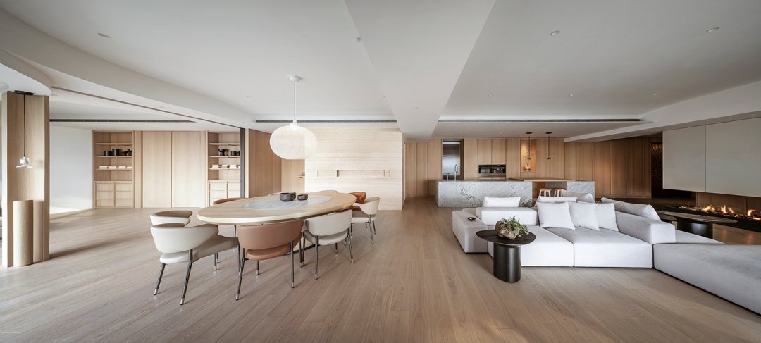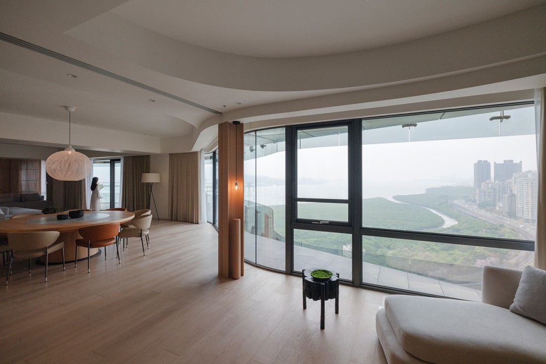 设计师以湾流为伴的生活方式,放任自然,渗入性灵。融合临窗南向的公共区域,从茶室、客餐厅到开放厨房,建筑依着宛如河道的曲面窗景而生。