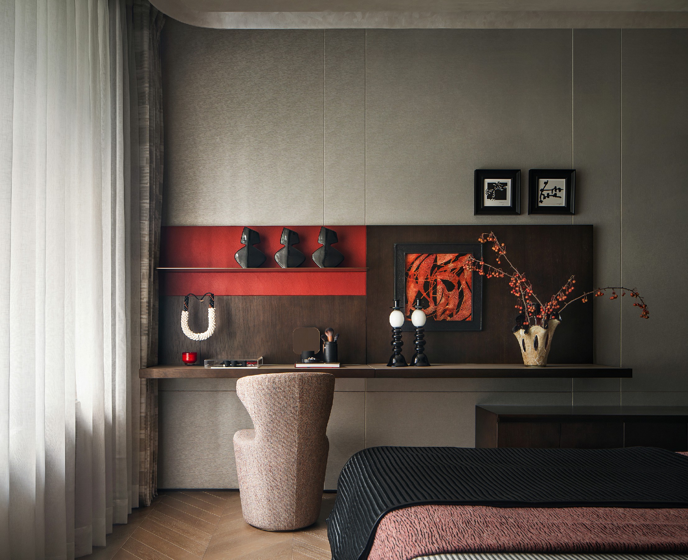 设计汲取自义乌文化广场的“城市礼盒”概念,凝练蕴含在地文化与东方气韵的“义乌红”,将人文关怀升华至艺术境界,让“家”的意义得以延伸至对于人、居所和居住之间关系的理解,使人们在建筑环境中,求索生活在“家”的意味,在这里,勾勒栖居之诗,静享怡居。