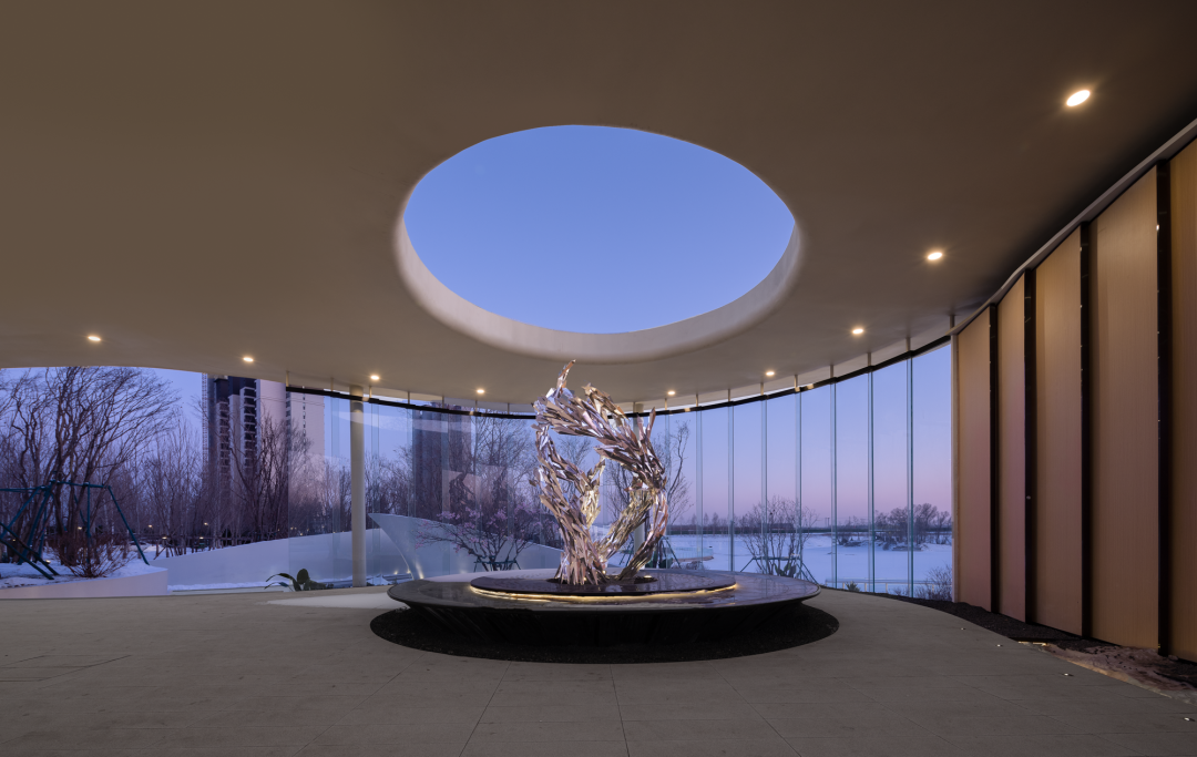 哈尔滨城边、雪景之中、湖心之上,恰似新月的御湖壹号在此落地,因自然的介入,光影幻形,时空渐生。设计取日湖上月、天上星、水里鱼、一叶舟等自然元素纳入空间。空间的流畅与蜿蜒,装陈在光影的配合下,有序、丰富、松弛、层次分明。当在疏阔的场域中游走、弥散,周遭的一切,化身为一种丰富的纯粹,促使身体、想象和环境的交流,静谧地安放在万物共生的光阴里。