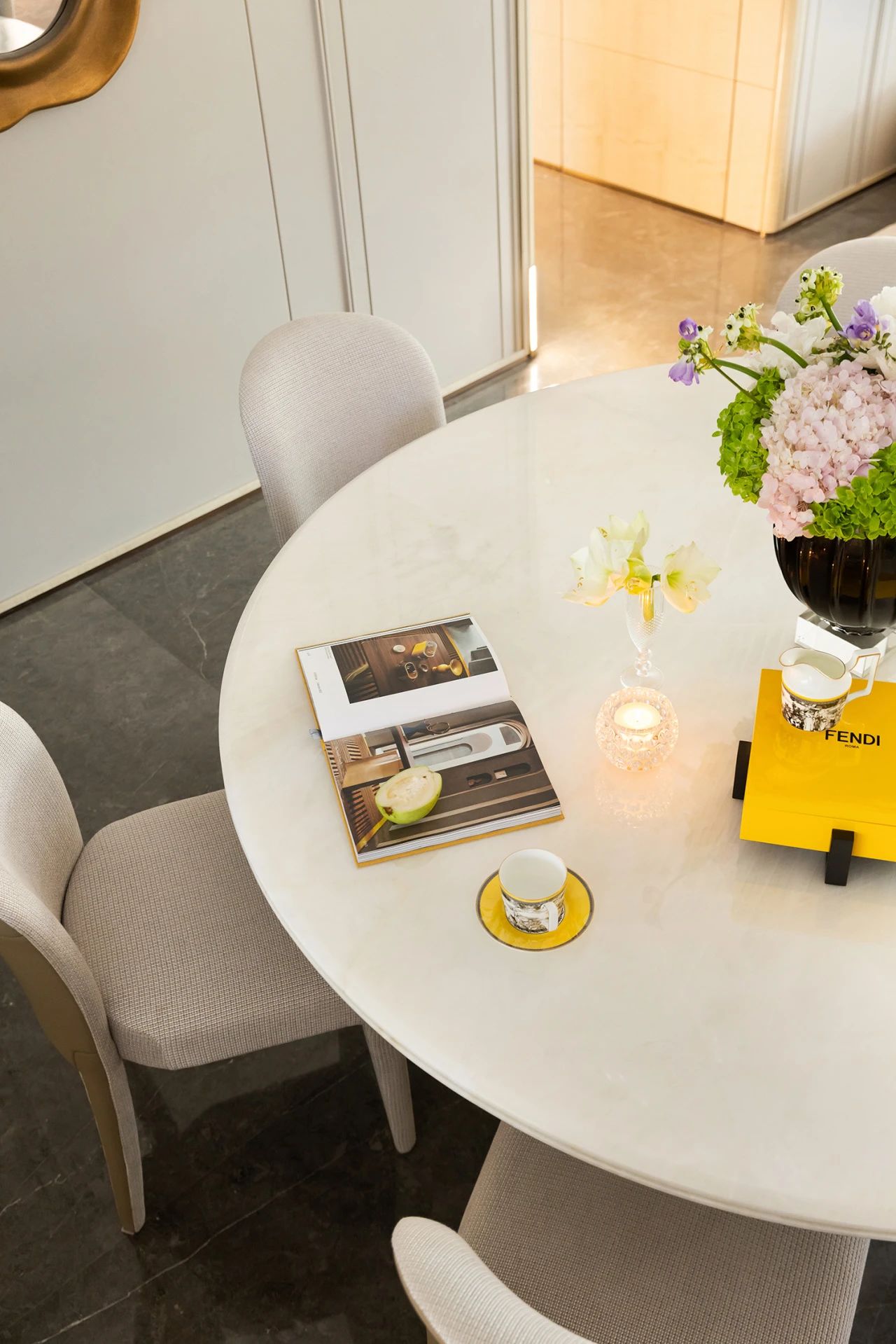 餐桌上方的水晶吊灯透过金属框镜面的反射,模仿花与叶的自然纹理。馥郁的花香和浓郁的饭菜香相互交缠,悄然钻进居者的鼻腔,引诱丰盛的食欲。生活的艺术性与烟火气共同生发,安放闲适的身心。