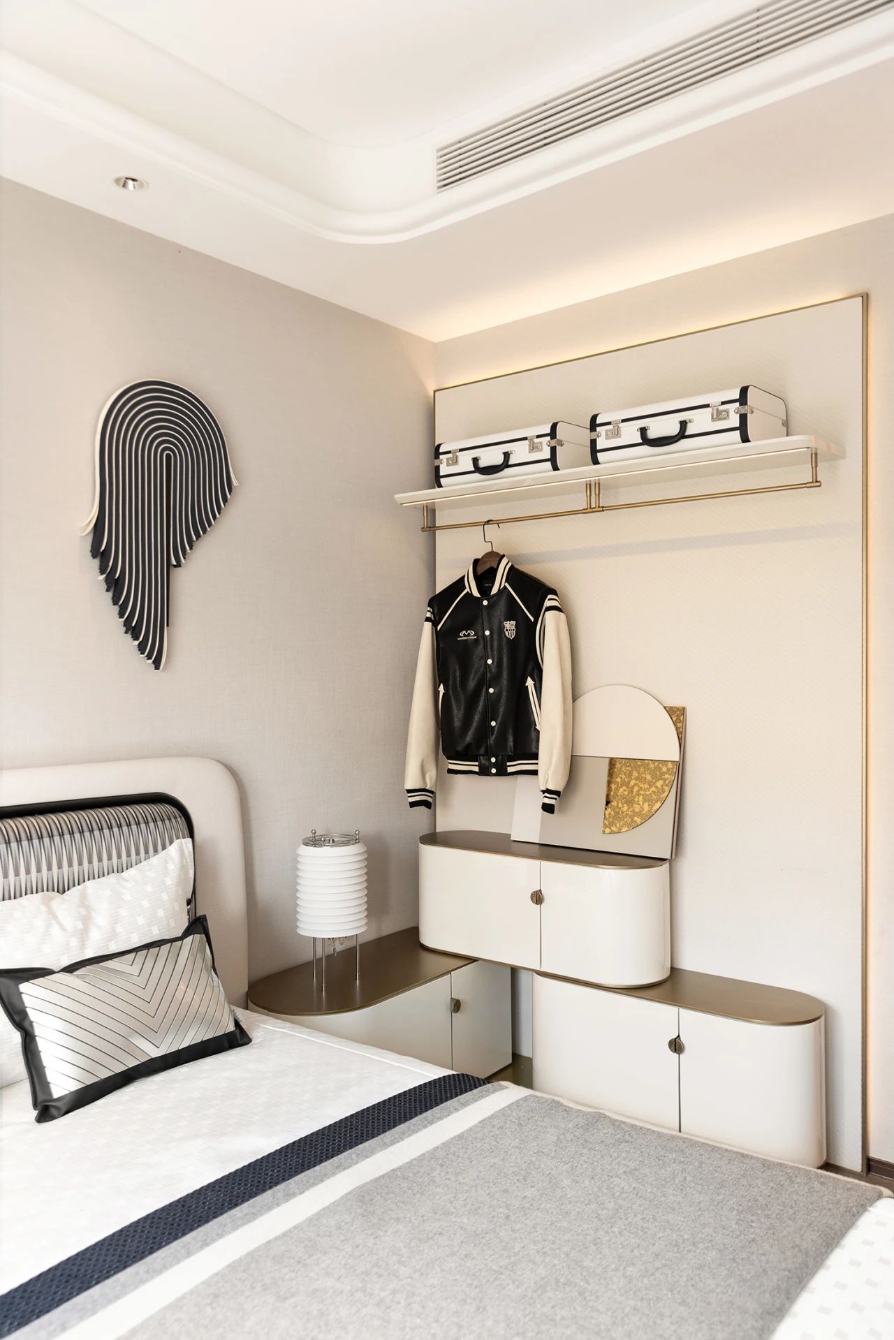 青春就是大胆和直白的代名词。少年人从不隐藏自己的心思,在只属于自己的一方天地里,尽情地展现关于日常、关于爱好、关于梦想的所有模样。在梦里翻越的网格栅栏床头背板,积木般搭建的床头柜,垂坠的黑白管道接口,无限延展的跑步弯道都是他彰显存在的证明。