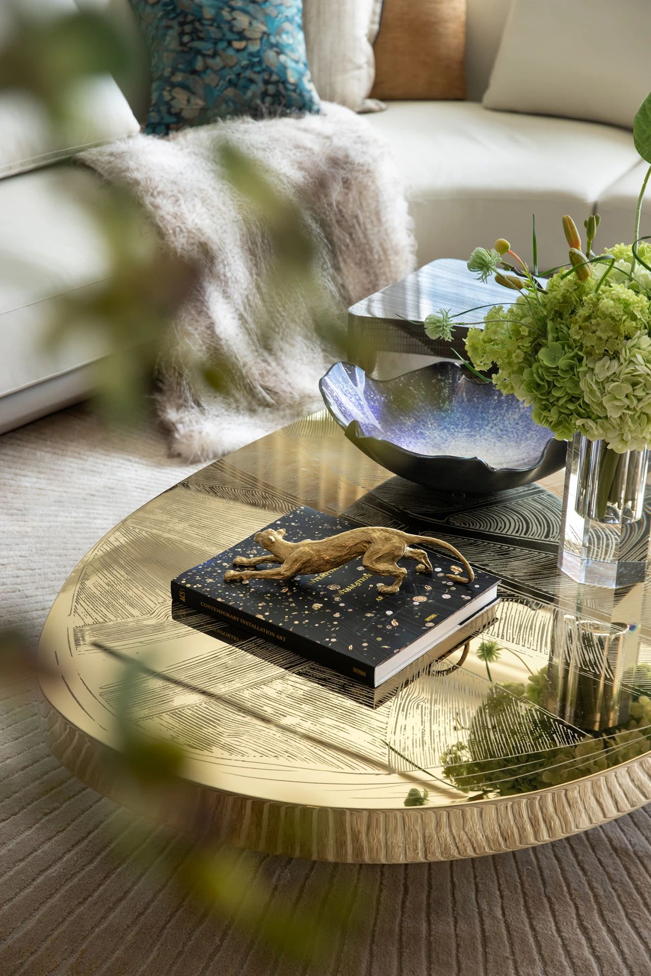 设计师悉心收藏自然的礼物,将日光封存在空间各处。亮黄的Fun Fendi系列单人沙发和橙色的透明边几留存太阳的绚丽色彩,若隐若现的填充材质增加了舒适的质感。BAXTER茶几化用太阳的形状,捕获花瓶上逃逸的琉璃行星。阳光的纹理永恒地印刻在绒布地毯中,融化场景的边界,生活陷进无垠的温柔乡。