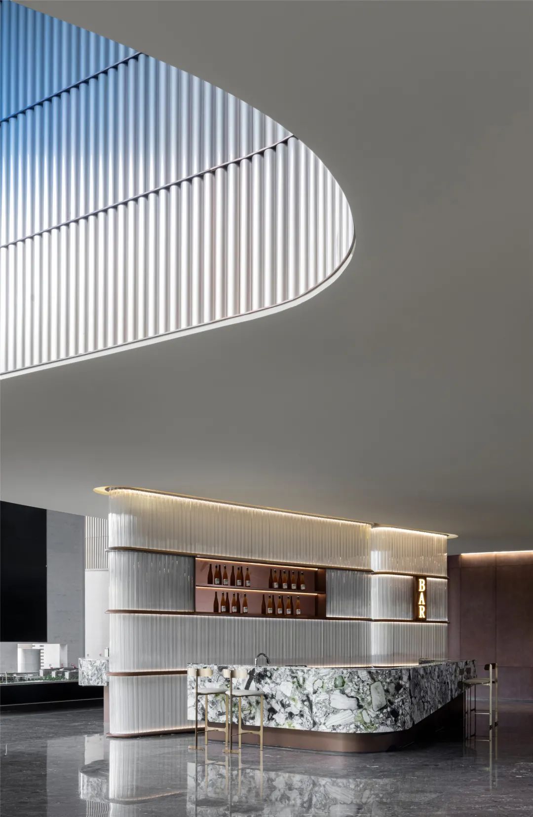 莹白似玉,皎洁如月,水吧的背景墙以澄澈透亮的柱形阵列构成,加之以三角形围合的大理石吧台,整个空间温润雅致的格调呼之欲出。而大理石的艺术肌理,于黑白灰的底纹上融入了一抹贵气的宝石绿,令空间更添韵味。