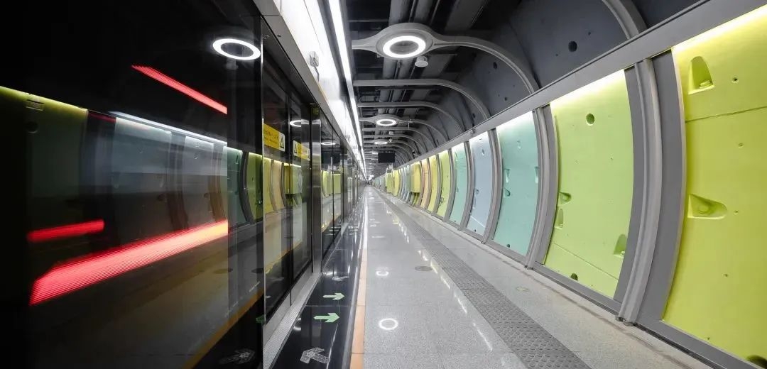 为契合嶂背站建筑空间的特殊性,设计团队以“穿越彩虹的车站”为主题,站台整体为裸装设计,结构管片上采用彩虹色系涂料作为装饰亮点,展露出结构美的同时让地铁犹如在“彩虹隧道”中穿梭,狭小的空间里,充满动态的活力与乐趣。