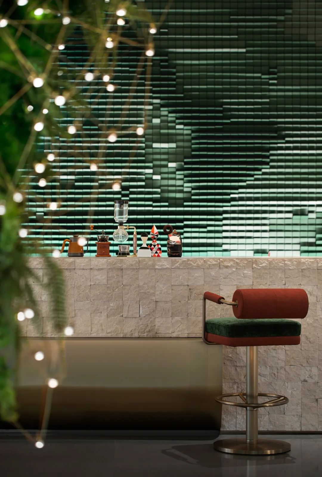 为了强化空间的主题概念,设计师在水吧区搭建起一个生态实验室场景。在此,小巧的植物装置透出勃勃的自然生机;盛放着浅橙色液体的玻璃器皿,描摹着先锋艺术的形式实验,令人们沉浸在美学与体验并呈的互动中。