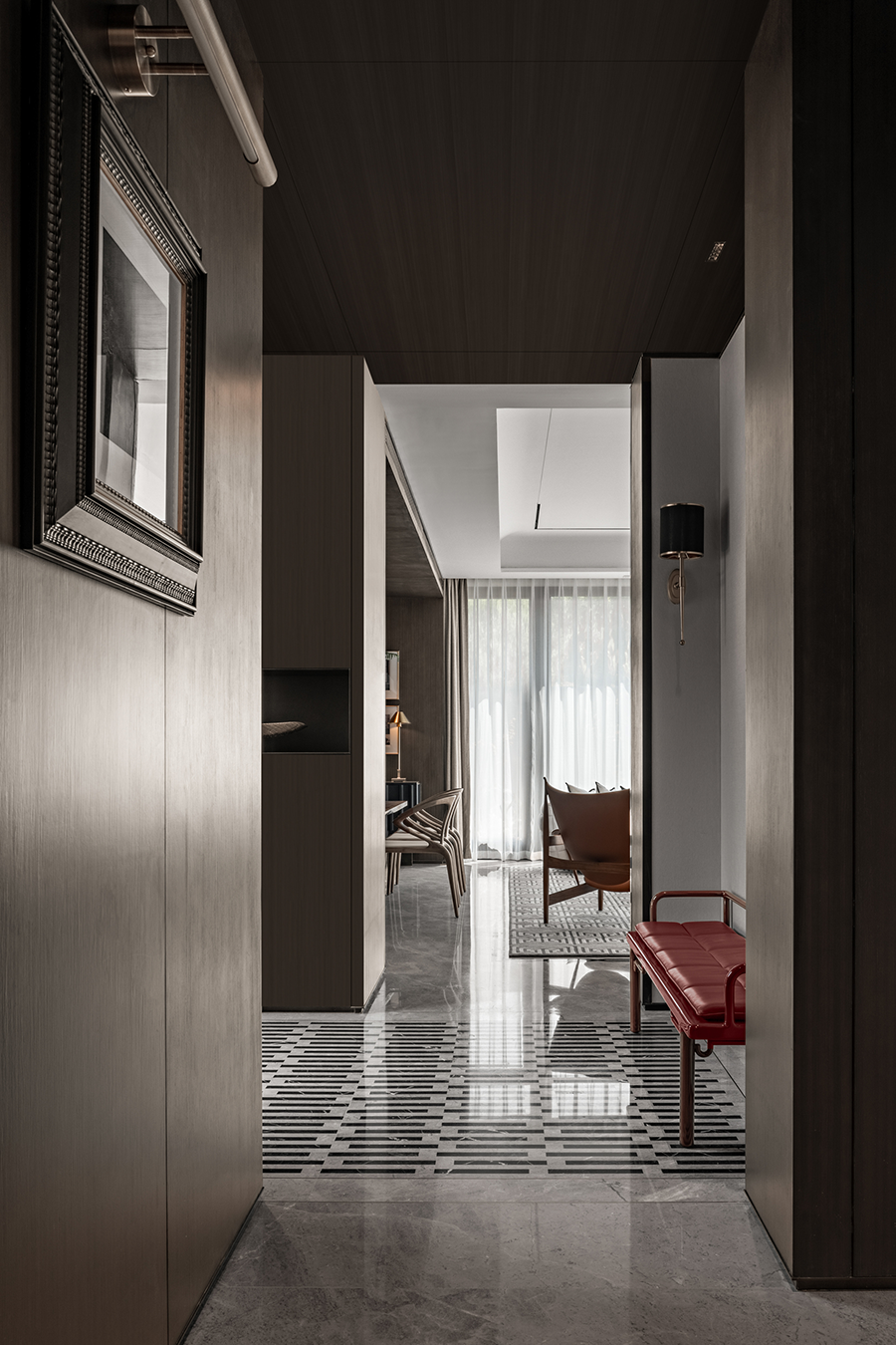 借助皮革、金属、石材和布料的交织,艺术吊灯、序列吊灯的汇聚,以及玻璃幕墙的守护,营造出私密又不失时髦的氛围,是更为纯粹的娱乐休闲沙龙空间。