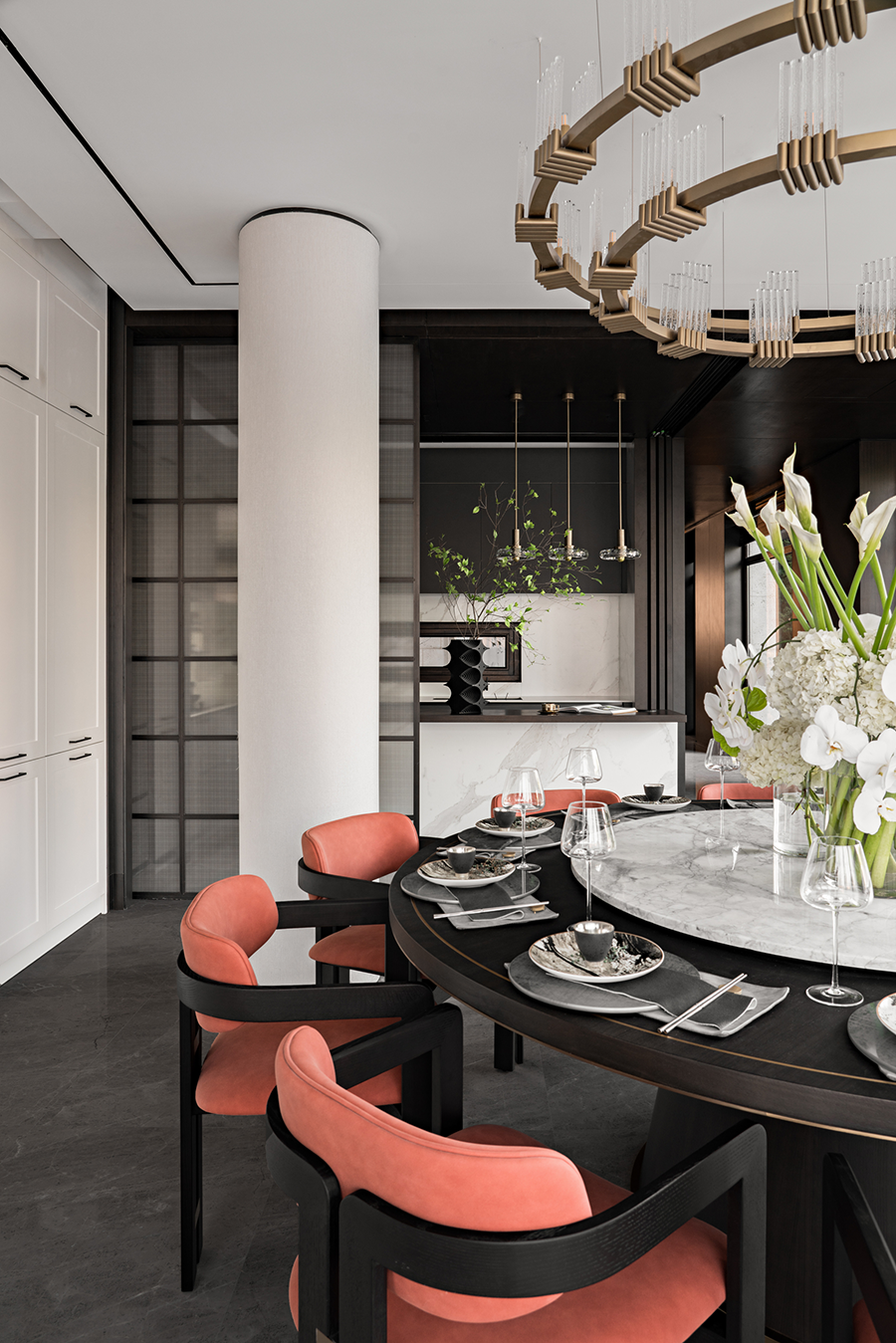 大规格圆餐桌与吧台满足东方家庭的团圆与现代简餐的自由,餐厅与庭院形成联动,营造花园般宴会厅情境。