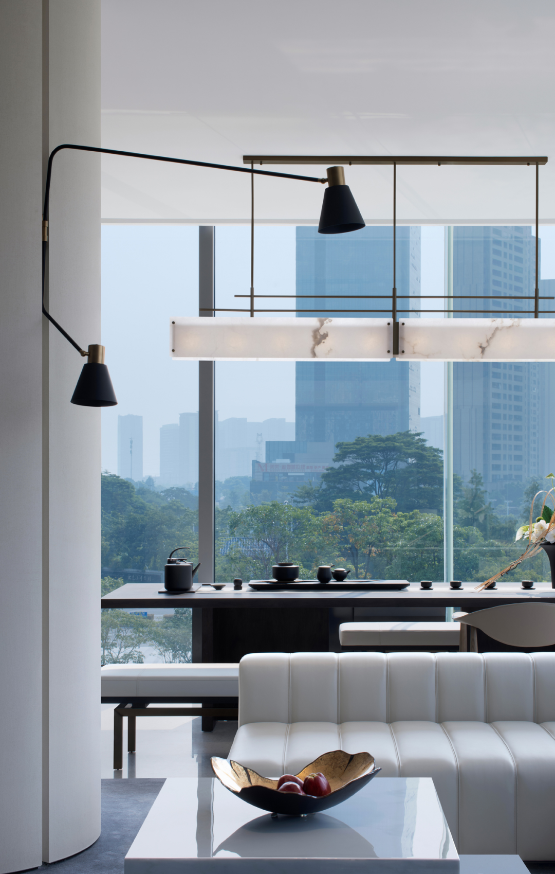 180°围合面的玻璃幕墙,将变幻的自然光与公园景致完全纳入室内,追求光与色的交融,形与意的共性,在简约质朴中见丰富,于光影中见层次。