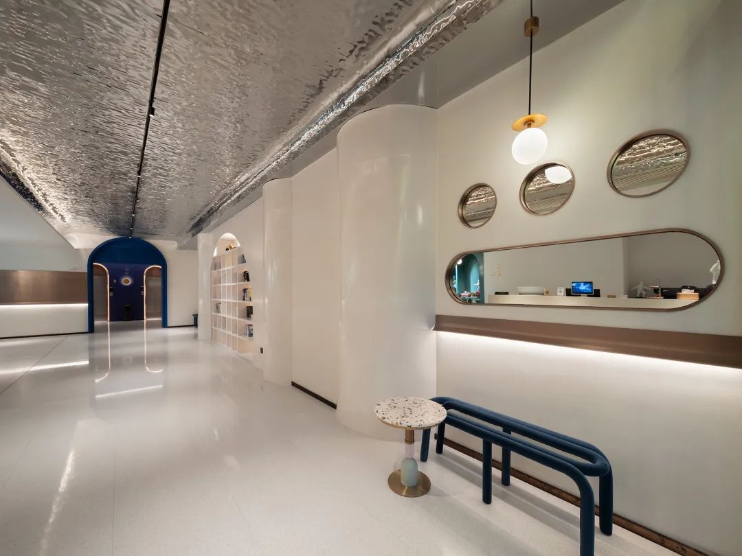 在空间的多维美学中,过厅的银色水波纹是引人入胜的待客之色;咖啡阅读区的彩色光影是漫度世界的悠闲之色;通往住房过道的纯白素简是漫步时空的探寻之色;客房内温润的原木与跳脱的红是度假时光的悦趣之色......