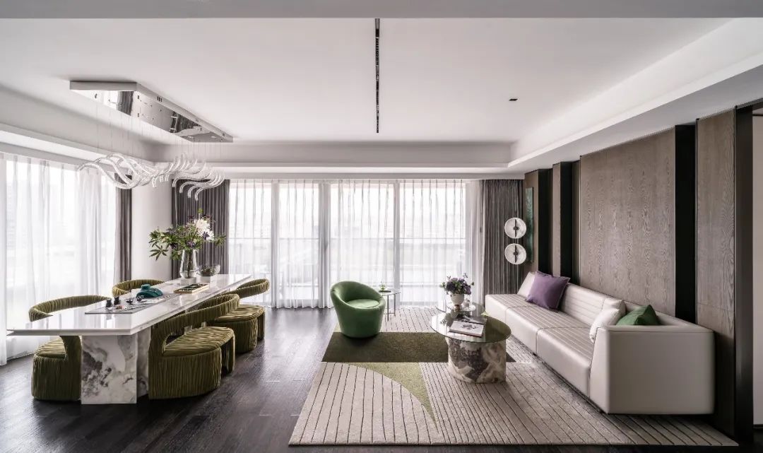 设计师的落笔,奠定在对居者感官想象的调动上。柔软而富有肌理感的墨绿绒面、一株灿烂盛开的鲜花,伴着阳光透过轻薄的纱帘洒入室内,人们不禁于此时此景中,联想起原野与森林,摩登而诗意。