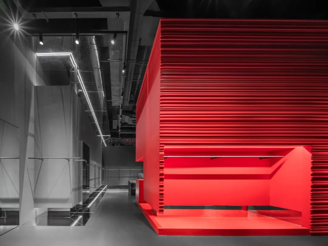 红色立方体静立于店铺中央,一面平行于商场临街玻璃幕墙,另一面以侧视角度面向商场内次入口,强视觉冲击力令其在整体纯粹灰色的冷调空间中成为艺术装置般的存在。