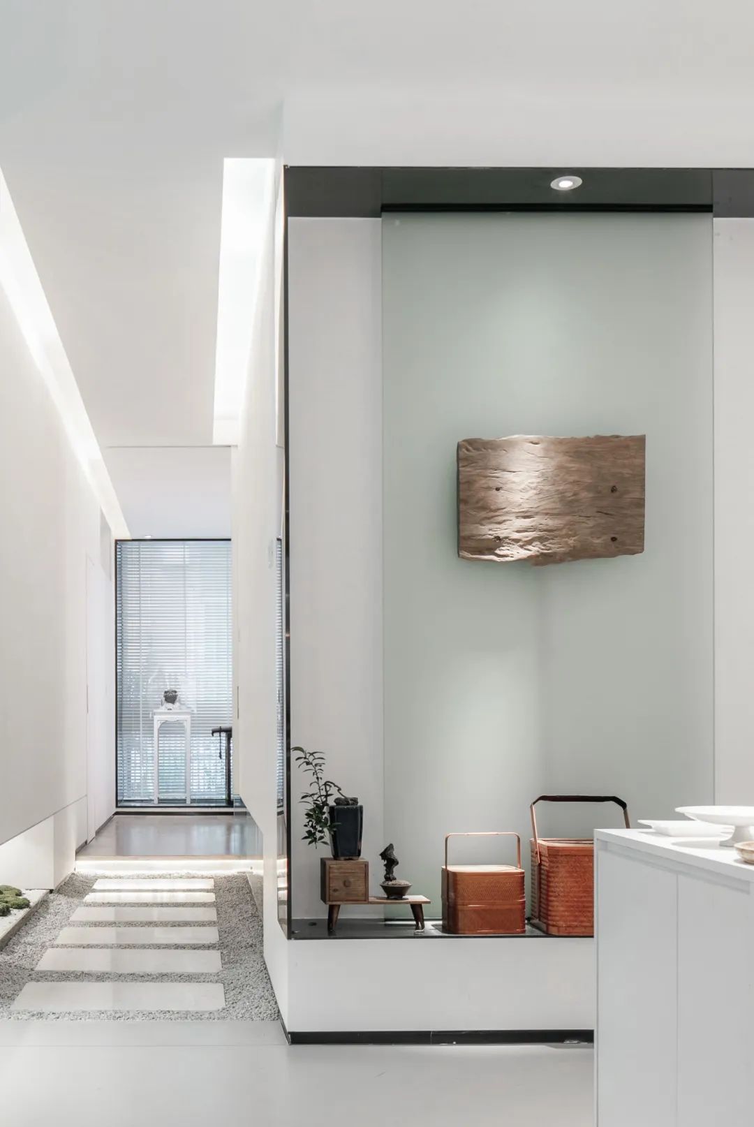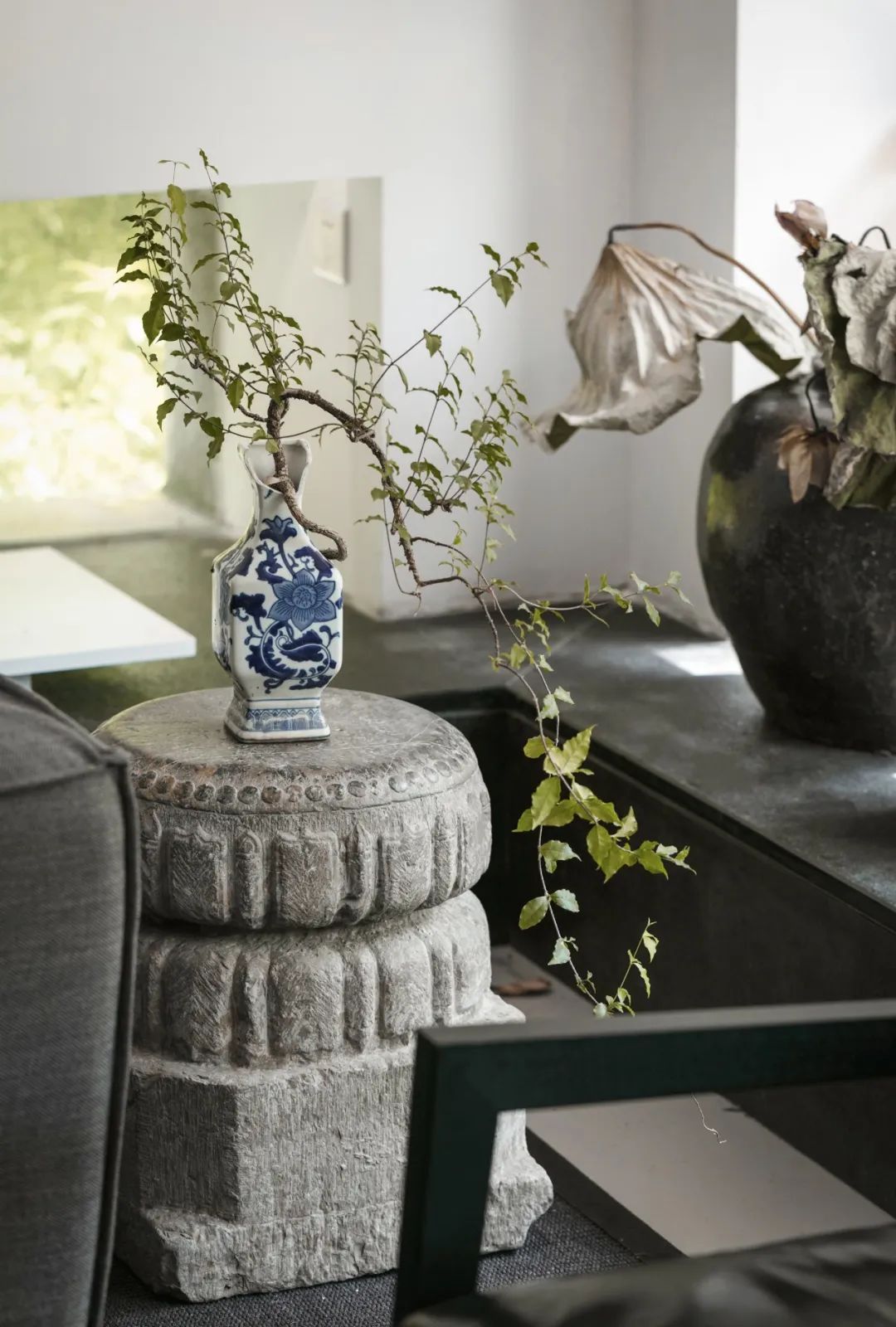 空间中的每一件旧物,都曾经拥有过沛然的生命力,在时间的流逝之中成为留存美好记忆的标本,不经意流露出的侘寂意味亦是一种独特的脱俗、静美。瓷器的残缺一角、石台的磨损印记、枯荷的过季形态、水槽的伴生青苔......一切美得不循常规,仔细观照,黯淡中有生活的况味。