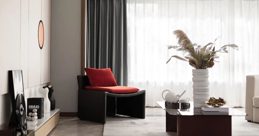 柿子红作为空间点缀,体现出硬装的干净素雅,低调简约的空间氛围配合着装饰色调,将现代主义的优雅体验与东方生活的独特意蕴融合于一体,创新表达出高雅绚烂的空间气质。