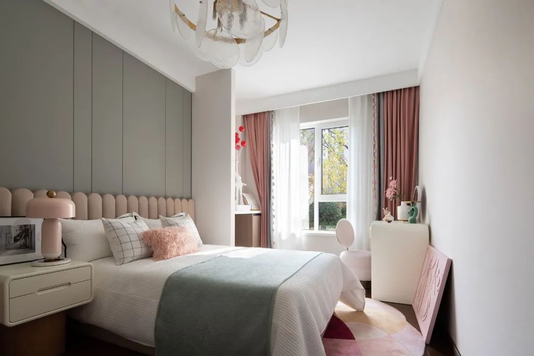 步入少女的房间,轻柔且优雅是设计的主题。温柔的粉调、柔美的弧面碰撞着低明度的灰绿墙面,搭配绒感鸭蛋青的毛毯床品,宁静温暖的气息得以细腻的表达。