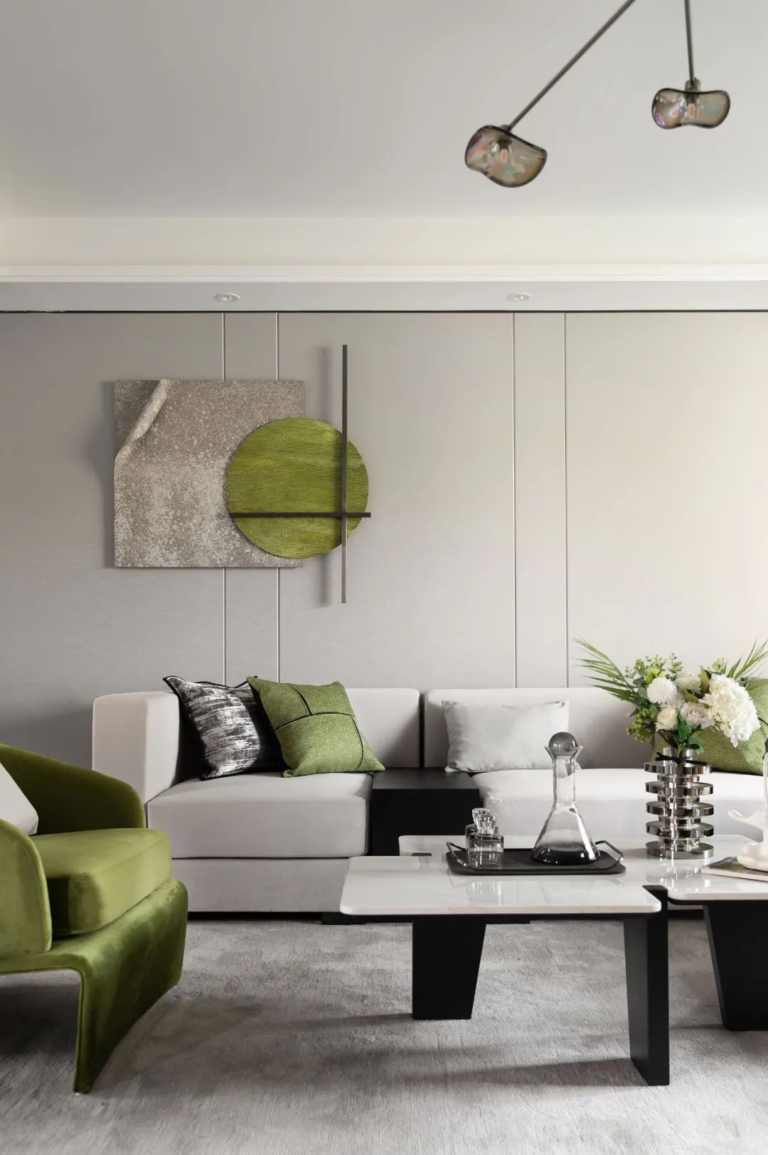 黑色金属与浅色大理石构成的茶几呼应着黑白相间的沙发,调动着整体起居空间的风味。在设计师的当代手法下,极富肌理色彩的绿色布艺装置与米灰色的墙面,勾勒出高级的线条感和自然质朴的氛围。