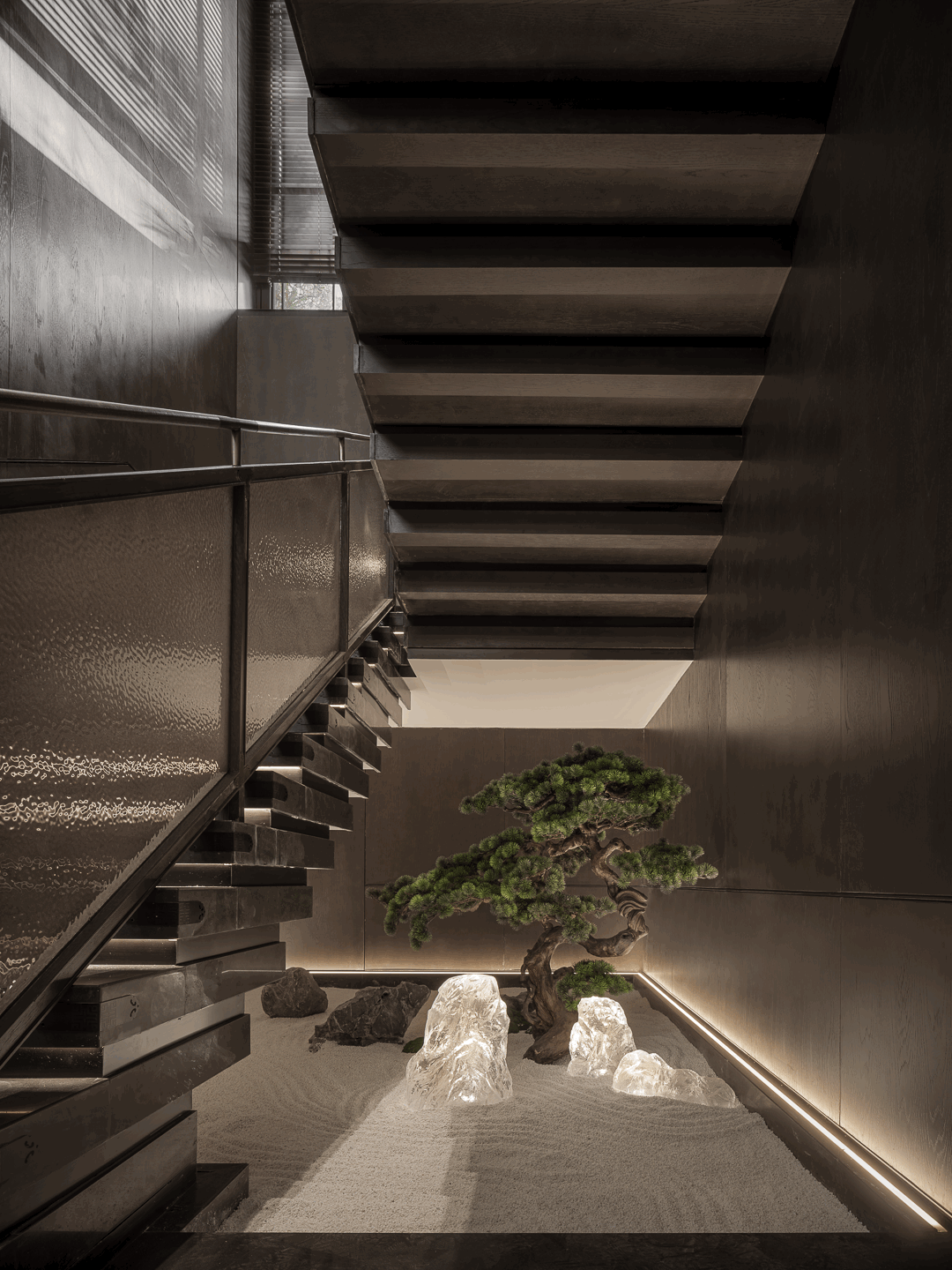 步上散落着松下萤石的枯山水小景的踏步楼梯,便是营销中心二楼的洽谈区,首先映入眼帘的便是“孤舟蓑笠翁,独钓寒江雪”的艺术端景。