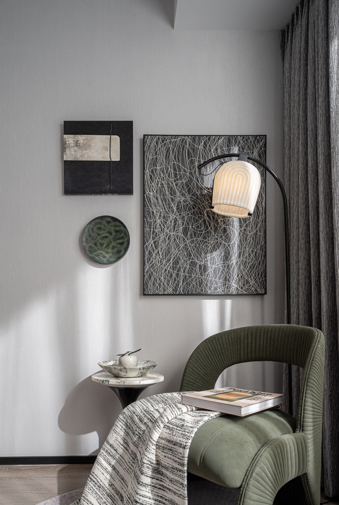 布设精雅的书房,是一处静心办公或读书的场域,亦是居者精神的休憩地。从情境的勾勒入手,墙面书柜的物件点缀,生动地流露出主人的不凡品味;一隅的暗绿绒面单椅,加之嵌着理石花纹的茶几式扶手、几幅线条与几何样式的挂画,构就着一张一弛的仪式感,昭示生活中的细腻与质感。
